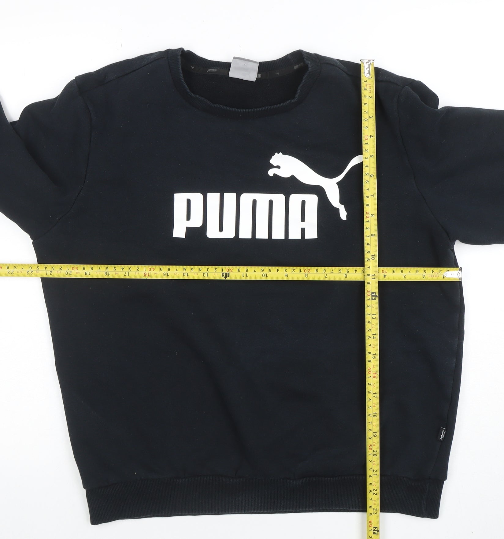 Refresh your casual wardrobe with this classic black Puma men's sweatshirt, designed for both comfort and sporty streetwear style. Crafted from a soft and durable jersey blend of cotton and polyester, this pullover sweatshirt offers breathable warmth ideal for autumn, winter, and spring wear. The regular fit with a crew neckline provides a timeless and relaxed feel, perfect for layering or for wearing on its own. Featuring the bold Puma logo across the chest, this piece embodies iconic athletic fashion with a modern edge. Long sleeves and ribbed cuffs finish the sweatshirt, ensuring a snug fit that holds its shape while maintaining comfort during movement. Whether for casual days, gym sessions, or outdoor activities like running, training, and football, this versatile piece brings a confident, sporty vibe to any outfit. Suitable for men who value simplicity, quality, and the unmistakable Puma branding, it’s a must-have staple for any collection. Easy to maintain with machine wash care, this sweatshirt ensures convenience and reliability with every wear. Condition is excellent with minimal signs of wear, showing the high quality of the garment. Style yours with joggers for a laid-back athletic look or pair it with jeans for effortless weekend wear. A sharp, contemporary essential that balances comfort, performance, and signature branding, making it a perfect choice for year-round layering or solo wear. Ideal for those who appreciate timeless sports-inspired apparel that transitions seamlessly from gym to street.