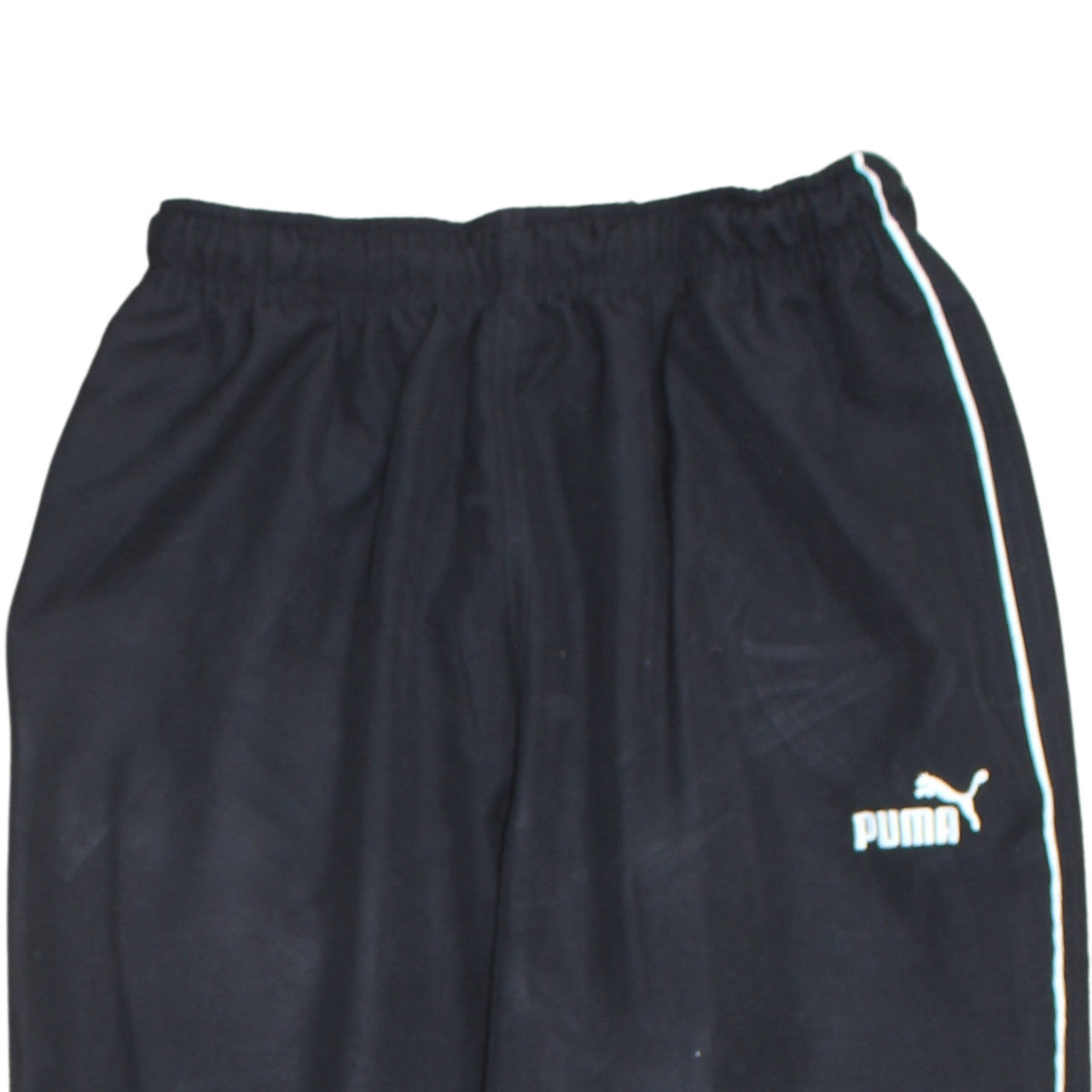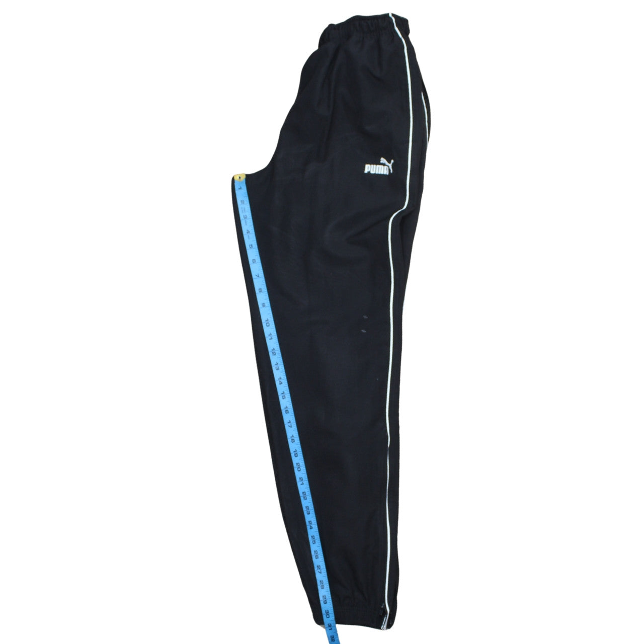 Step up your workout game with these classic men's black track pants from Puma. Designed for comfort and performance, these trousers are crafted from 100% polyester, delivering a lightweight and breathable fit ideal for all seasons and a range of activities. The regular fit ensures freedom of movement whether you're running, training, or heading out for a casual day. The elasticated waistband with an internal drawstring promises a secure and flexible fit, while the straight leg cut offers a relaxed and timeless silhouette. Sporting a sleek black colourway complemented by distinctive side stripe detailing, this pair combines sporty style with versatile appeal.The moisture-wicking polyester material keeps you cool and dry through workouts and active lifestyles. Puma’s iconic logo, positioned at the thigh, adds a touch of authenticity and brand heritage. These trousers are designed for practicality as much as style, offering easy care through simple machine washing. Perfect for gym sessions, jogging routes or relaxed streetwear outfits, the Puma track pants bring durable quality with comfort at their core. A staple in any activewear wardrobe, these trousers embody effortless style for today’s athlete or weekend lounger alike. In very good pre-owned condition with only light signs of use, they offer excellent value for everyday wear. Pair them with a hoodie and trainers for a complete, casual Puma look, or team them with your gym top for a sharp yet comfortable workout outfit. Functional, stylish, and made to move with you—these Puma track pants are ready for performance whenever you are.