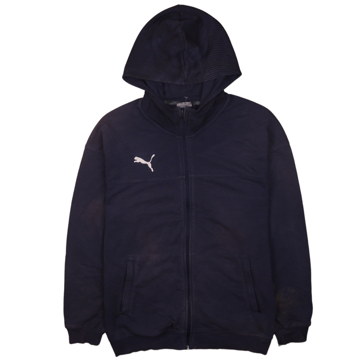 Stay casual, comfortable, and stylish with this authentic Puma Men’s Blue Full Zip Hoodie Sweatshirt in size Medium. Designed for everyday wear and athletic performance, this versatile hoodie combines classic sportswear design with modern comfort. Crafted from a soft blend of cotton and polyester fleece, it offers a warm yet breathable feel, ideal for layering in cooler weather or wearing on its own during transitional seasons. The navy blue tone is both timeless and versatile, easy to pair with jeans, joggers, or shorts for a clean, sporty look. Featuring the iconic Puma logo embroidered on the chest, this hoodie proudly represents a trusted global brand known for its quality and performance. The full-zip design allows easy wear, while the adjustable hood offers extra coverage against chilly winds. Front pockets provide practicality for carrying small essentials or keeping your hands warm on the go. The regular fit ensures a relaxed, comfortable silhouette without being too baggy.Perfect for active days, casual outings, or lounging at home, this hoodie suits men who value both comfort and style. It’s ideal for gym sessions, jogging, football training, or weekend wear. Built to handle all seasons, especially autumn and winter, the durable cotton-polyester blend ensures lasting softness and reliability through countless washes. In very good pre-owned condition, this hoodie shows only slight fading on the sleeves, preserving its overall excellent appearance and structure. Whether you’re upgrading your athleisure wardrobe or seeking a reliable everyday hoodie, this Puma Full Zip Sweatshirt offers practicality, brand appeal, and distinctive style at great value. With its classic design and trusted quality, it’s an essential piece for any modern man’s collection.