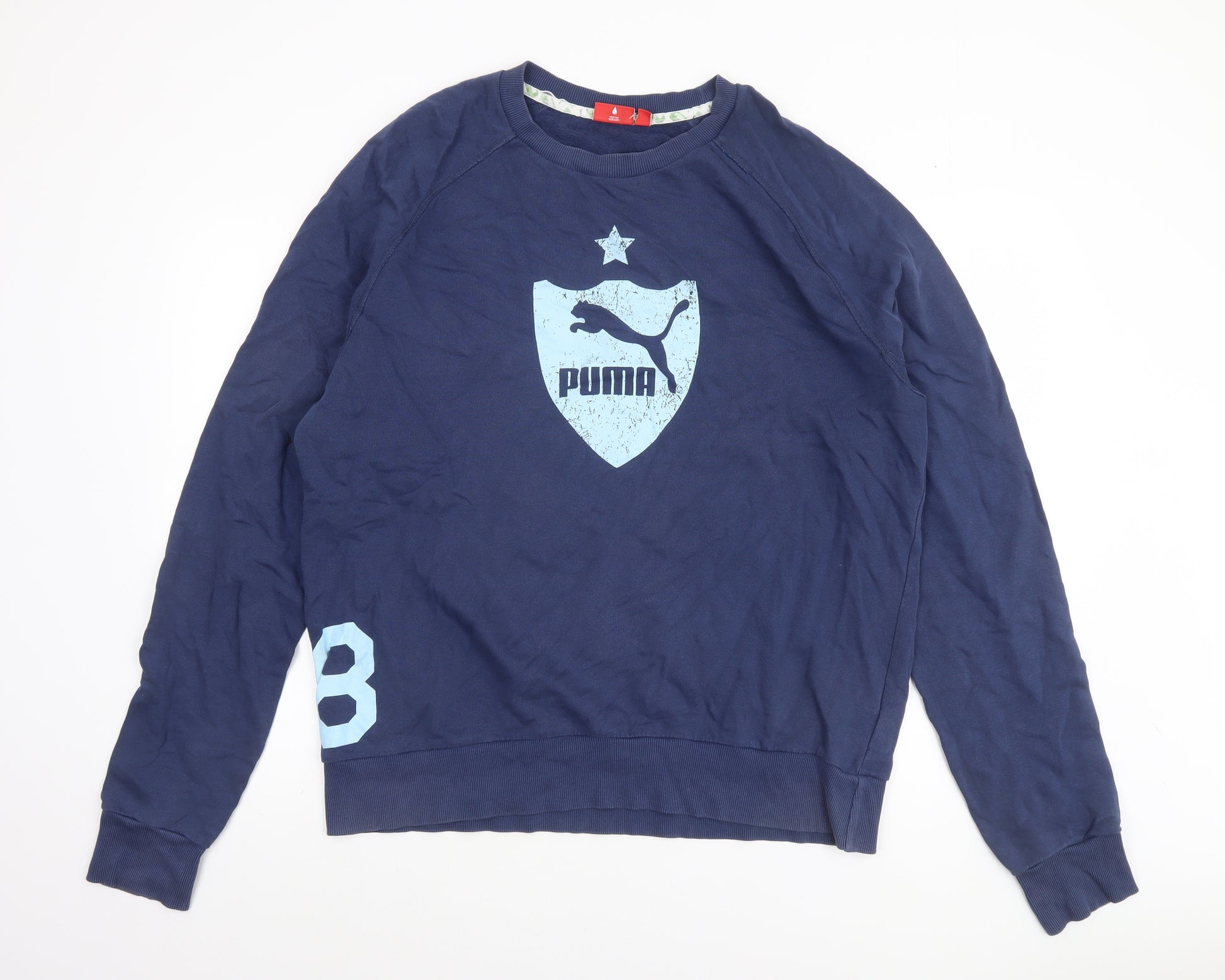 Get a classic sporty look with this Puma men's blue pullover sweatshirt – a perfect blend of comfort, style, and performance. Crafted from 100% cotton jersey, this sweatshirt delivers soft, breathable wear for any casual or workout occasion. Featuring the iconic Puma logo printed boldly across the chest and sporty details such as the number graphic on the sleeve and back, this piece adds signature athletic flair to your wardrobe. Designed in a crew neck style with long sleeves and ribbed trims at the cuffs and hem, it provides a relaxed yet structured fit that flatters all body shapes. The lightweight cotton fabric ensures it’s ideal for layering in cooler months or wearing alone during transitional weather, making it suitable across autumn, spring, and winter. The regular fit and durable construction make it great for everyday use—from gym sessions and running errands to casual nights out. The sweatshirt is free from major defects but shows light signs of previous wear, keeping it in very good condition. The versatile blue colour pairs effortlessly with denim jeans, joggers, or athletic shorts, allowing you to create easy sporty looks. Whether you’re heading to football practice, warming up at the gym, or adding a streetwear touch to casual wear, this Puma sweatshirt provides all the comfort and style needed. Machine washable and built for all-season versatility, this sweatshirt delivers long-lasting quality and sporty appeal. Upgrade your wardrobe with this comfortable and reliable essential from one of the world’s favourite athletic brands – the Puma men's crew neck sweatshirt is a perfect everyday choice that effortlessly combines performance and street style.