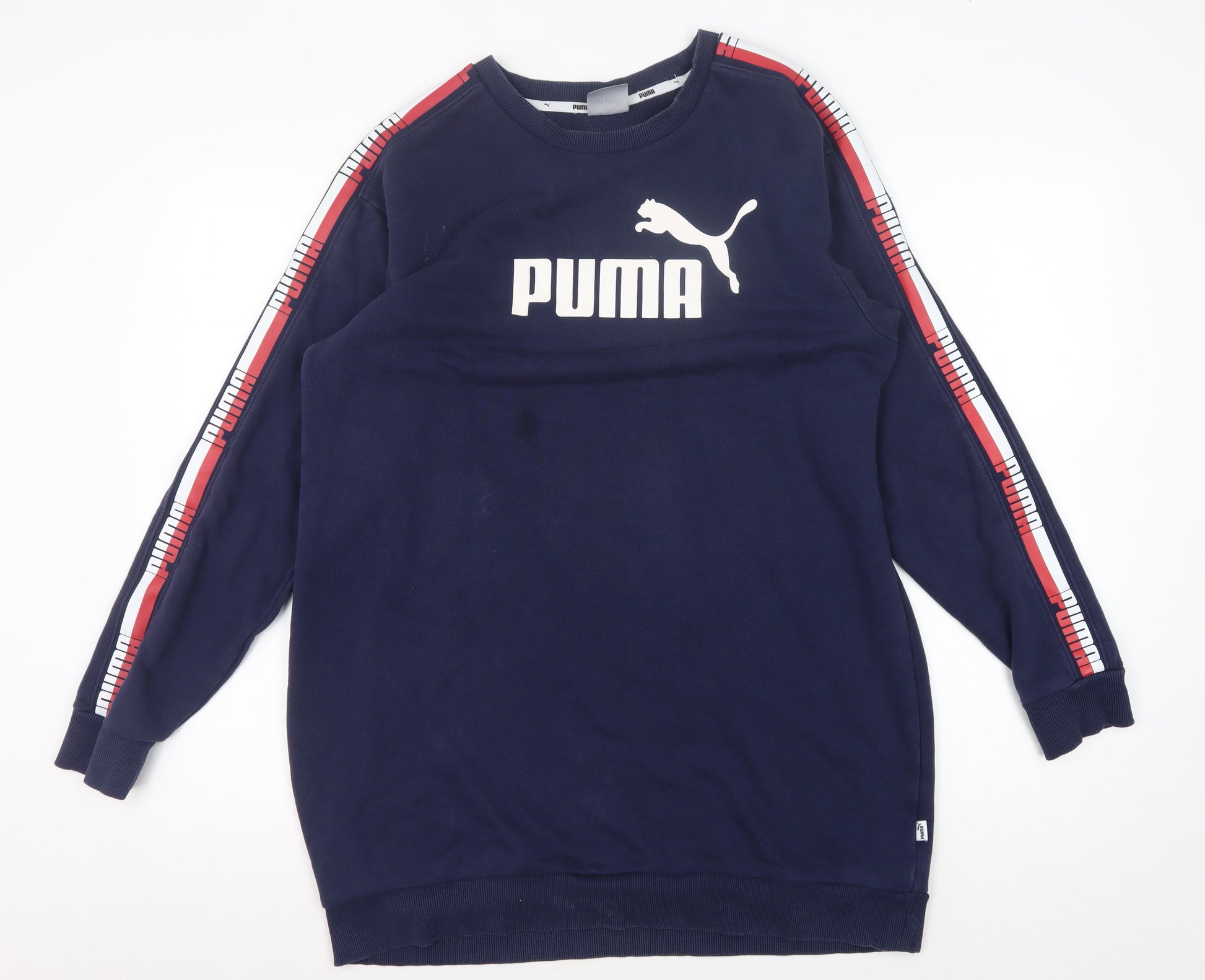 Elevate your sportswear collection with this stylish Puma women's sweatshirt. Crafted for both comfort and performance, it features a graphic print and bold logo design that stands out. The sweatshirt is made from a blend of cotton and polyester, ensuring both softness and durability, perfect for casual and activewear occasions. Its regular fit and raglan sleeves offer unrestricted movement, while the crew neck and long sleeves make it ideal for autumn and winter activities. Whether worn for a casual outing or a gym session, this sweatshirt promises style and functionality. The dark blue colour adds a versatile touch, easily paired with a variety of outfits. Despite some slight wear, the condition is excellent with the logo remaining vibrant, ready to make a statement in your wardrobe.