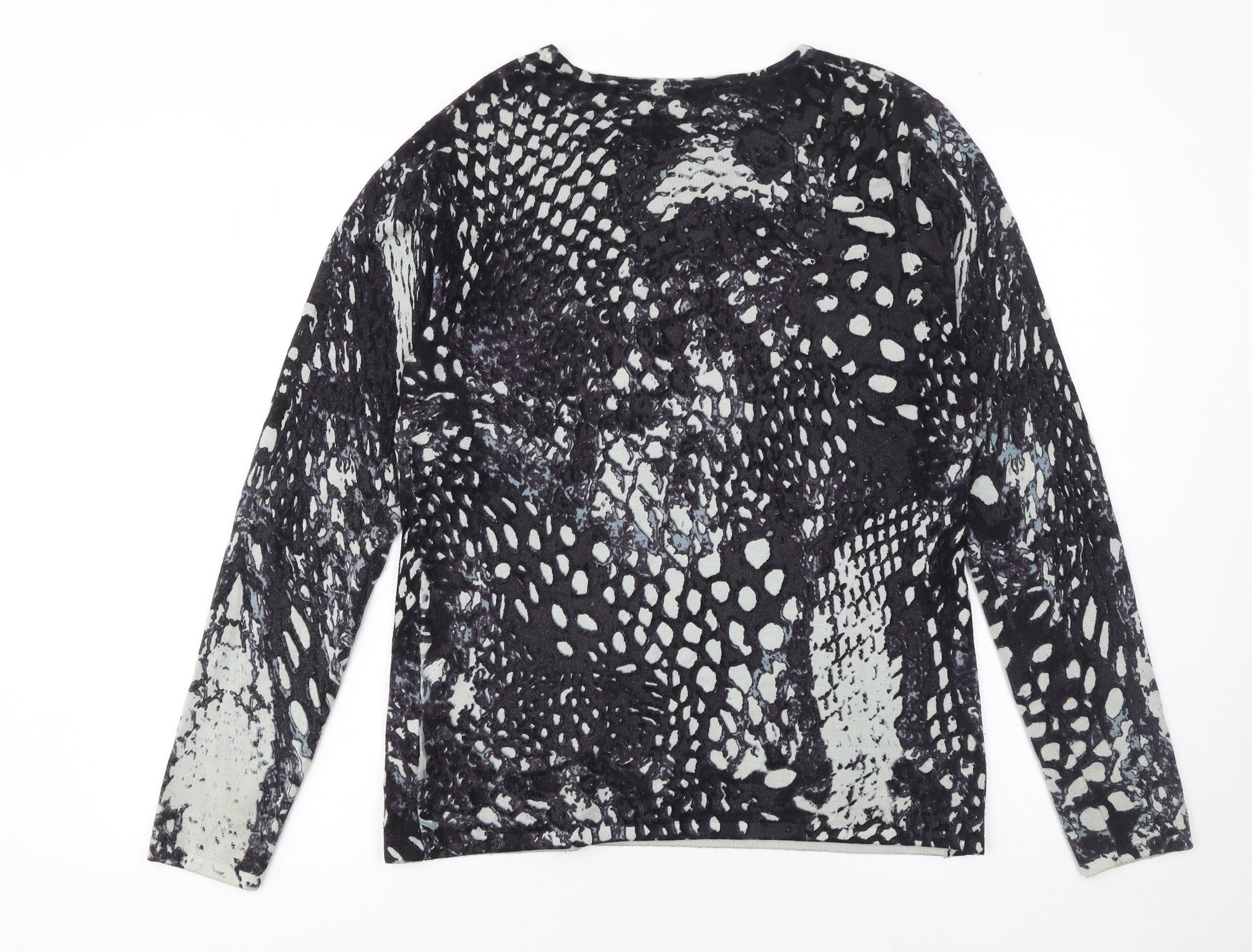 Add a touch of modern glamour to your wardrobe with this stunning black sequin pullover jumper from Punt Roma. Designed for women, this medium-sized piece beautifully blends comfort and style, featuring a sophisticated animal print pattern with scattered sequins that shimmer subtly under the light. The regular fit and long sleeves make it ideal for cooler seasons, offering an easy yet flattering silhouette suitable for both casual and semi-formal occasions. Crafted from a soft, stretchy knit composed of 70% viscose, 20% polyamide, and 10% elastane, it provides a comfortable and breathable feel with just the right amount of flexibility to move effortlessly throughout your day. The round neckline complements the overall sleek design, while the tight-knit fabric ensures durability and a gentle drape over the body. Perfect for autumn and winter wear, this jumper pairs wonderfully with tailored trousers, denim jeans, or skirts, adding versatile charm to your outfit choices. The lightweight construction allows comfortable layering under coats or blazers when temperatures drop. True to Punt Roma’s reputation for refined fashion, this piece reflects European craftsmanship with attention to texture, finish, and unique visual detail. Suitable for everyday wear, office layering, or evening gatherings, it is both practical and stylish. The sequined accents lend subtle sparkle without overpowering the elegant print, offering just the right balance between chic and understated luxury. The jumper remains in excellent condition with minimal signs of wear and all embellishments secure. Enhance your seasonal wardrobe with this eye-catching yet comfortable piece that effortlessly combines classic design with contemporary flair. Whether dressing up for a dinner date or dressing down for a relaxed day out, this Punt Roma sequin print jumper is the perfect versatile choice for the modern woman who values comfort, elegance, and individuality.