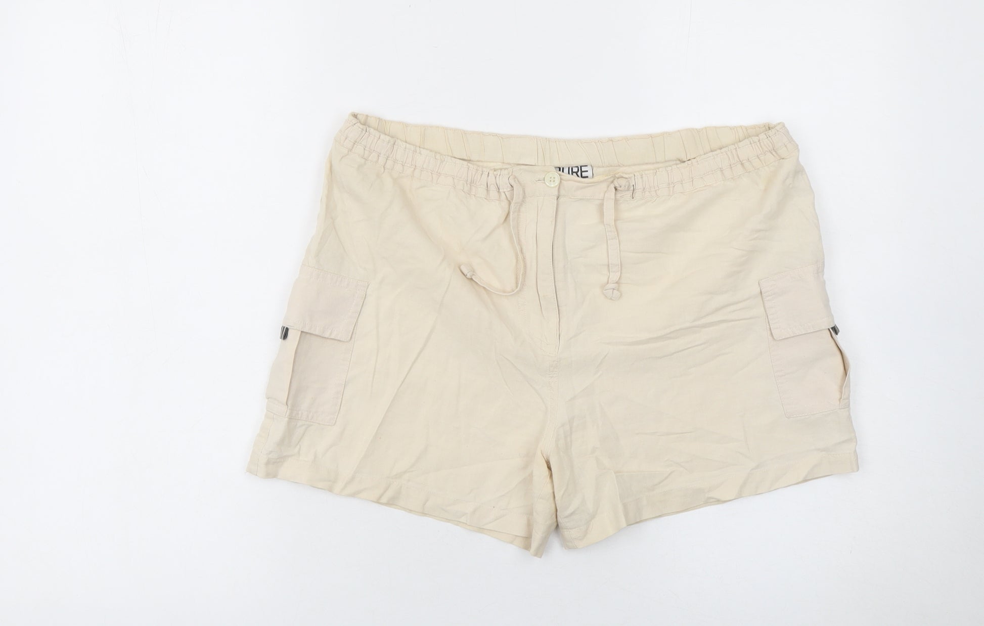 These PURE ORIGINAL women’s beige cargo shorts offer practical comfort and classic style, perfect for everyday wear or laid-back summer days. Crafted from 100% cotton, the material ensures breathability and a soft touch against the skin, making them ideal for warm weather. The light beige tone provides a versatile base that pairs beautifully with casual tops, tank tops, or lightweight shirts.Designed with functionality in mind, these shorts feature dual side cargo pockets and convenient slash pockets, allowing you to carry essentials with ease. The drawstring and button closure at the elastic waistband offer an adjustable fit, combining comfort and style effortlessly. The relaxed regular fit makes them flattering for a range of body shapes and ensures ease of movement throughout the day.These shorts have a flat front and mid-rise cut, providing a neat and timeless silhouette that transitions seamlessly from a day out to relaxed evenings. Their cotton material is naturally lightweight and breathable, providing cool comfort even on hot summer days. Subtle elements like the neat stitching and minimalist design give them a simple, modern aesthetic.Ideal for casual occasions, warm-weather holidays, walks, and everyday wear, these shorts embody effortless comfort and reliability. The light colour and classic cut make them easy to match with neutral or bold hues, while their sturdy cotton fabric ensures long-lasting durability with regular machine washing. Whether paired with sandals, trainers, or casual flats, they make a practical yet stylish addition to any summer wardrobe.In excellent pre-loved condition with minimal signs of wear, these cargo shorts are a perfect blend of quality and casual charm at an affordable price. Treat yourself to breathable comfort and timeless appeal with these cotton shorts ideal for spring and summer adventures.