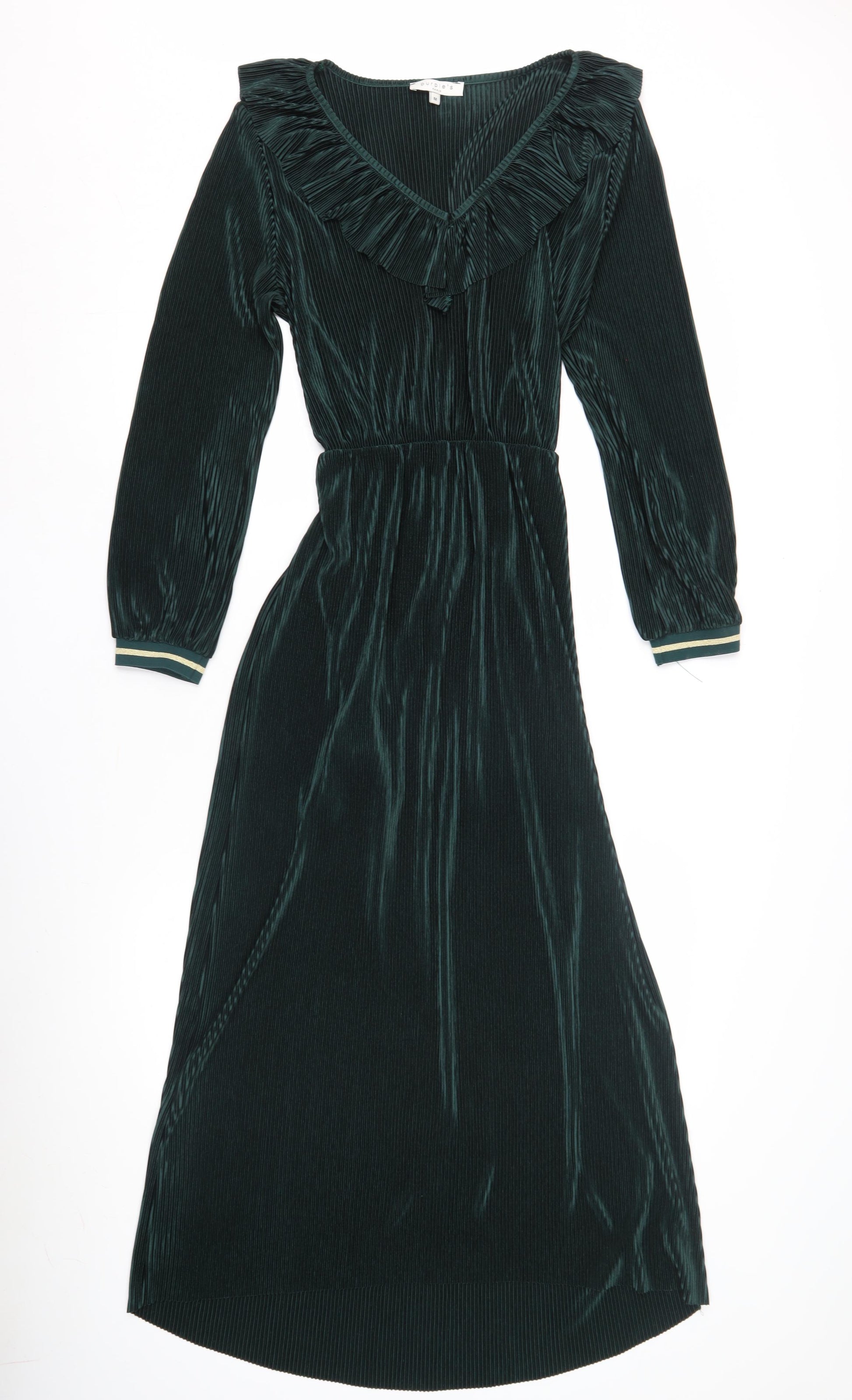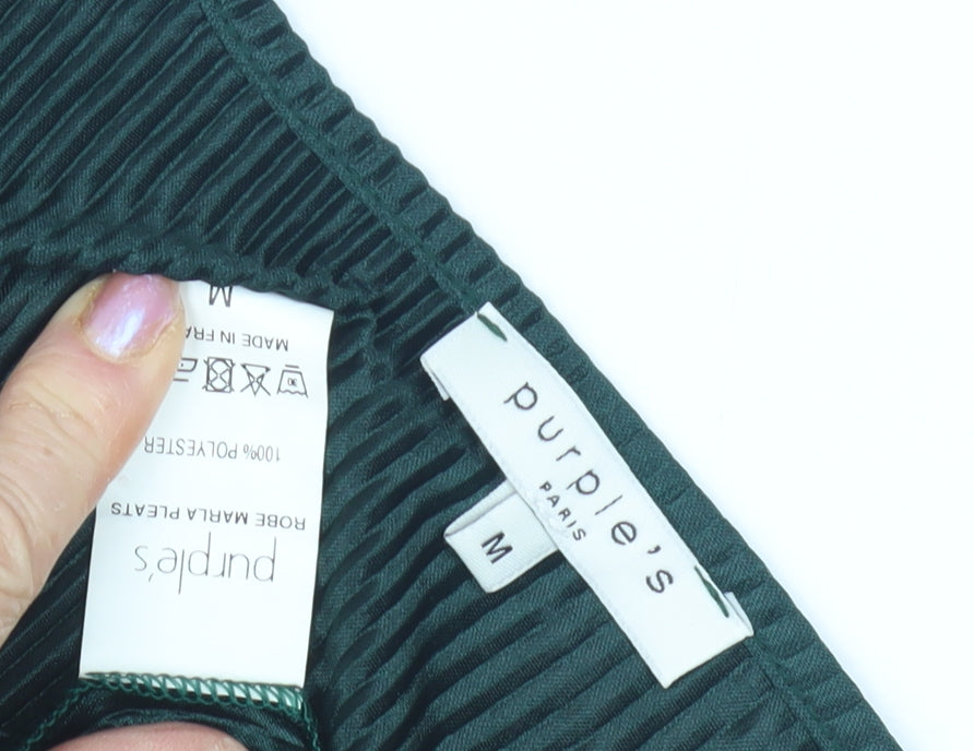 This elegant dress by Purple's Paris in a captivating green shade is perfect for making a statement. Ideal for women who value a blend of style and comfort, this dress features a classic V-neckline and long sleeves. Crafted from 100% polyester, the fabric gives a luxurious feel with a touch of soft texture. The ruffle accents add a dash of sophistication, complementing its sleek design. With a machine washable feature, it offers convenience alongside chic fashion. Whether you're heading to a casual gathering or a special event, this dress transitions effortlessly from day to night. In excellent condition, this piece shows minimal wear with no visible signs of damage. Bring versatile elegance to your wardrobe with this stunning piece.