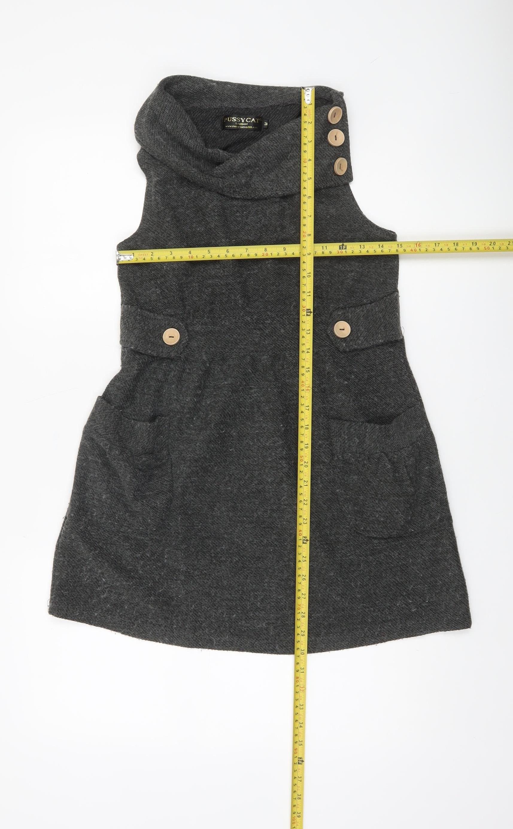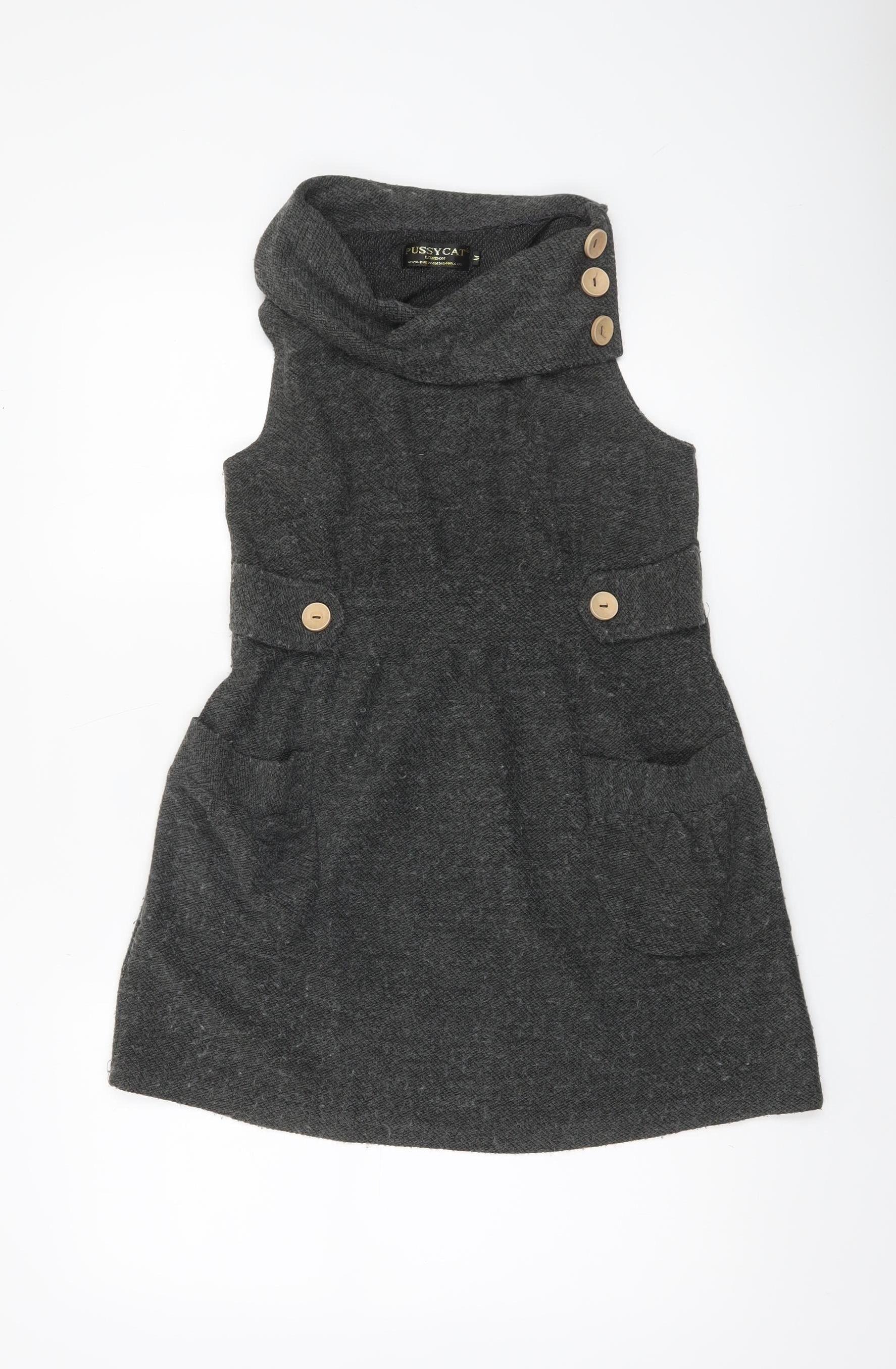 This stylish Pussycat London women’s sleeveless tunic jumper in grey offers timeless comfort with a modern twist. Made from a soft and stretchy knit blend of 95% acrylic and 5% elastane, it provides a flattering and comfortable fit while maintaining its shape. The cowl neck design adds a chic, contemporary look, complemented by attractive button accents along the shoulder and waist for subtle detail. Perfect for layering over a long-sleeve top or wearing alone during transitional seasons, this tunic is versatile and easy to style. The grey tone ensures it pairs seamlessly with a variety of outfits, from casual denim to smart leggings or tights, making it suitable for both everyday wear and slightly dressier occasions. Its regular fit and knit texture make it a cosy addition to an autumn or winter wardrobe. Practical and fashionable, this piece strikes a perfect balance between comfort and sophistication. The Pussycat London brand is known for delivering trendy wardrobe essentials with an urban edge, and this tunic jumper is no exception. Designed for women who appreciate effortless style, it offers stretch for ease of movement and enduring comfort. Ideal for casual outings, relaxed office settings, or weekend get-togethers, it’s a must-have layering piece through cooler months. Conditioned in very good pre-owned state with only minimal signs of light wear, this jumper remains soft and well-maintained. A wonderful choice for someone seeking both quality and affordability in a chic knit style. Dress it up with knee-high boots and statement jewellery, or keep it low-key with trainers and a jacket for a contemporary take on cold-weather fashion.
