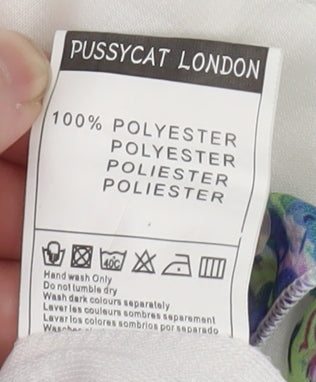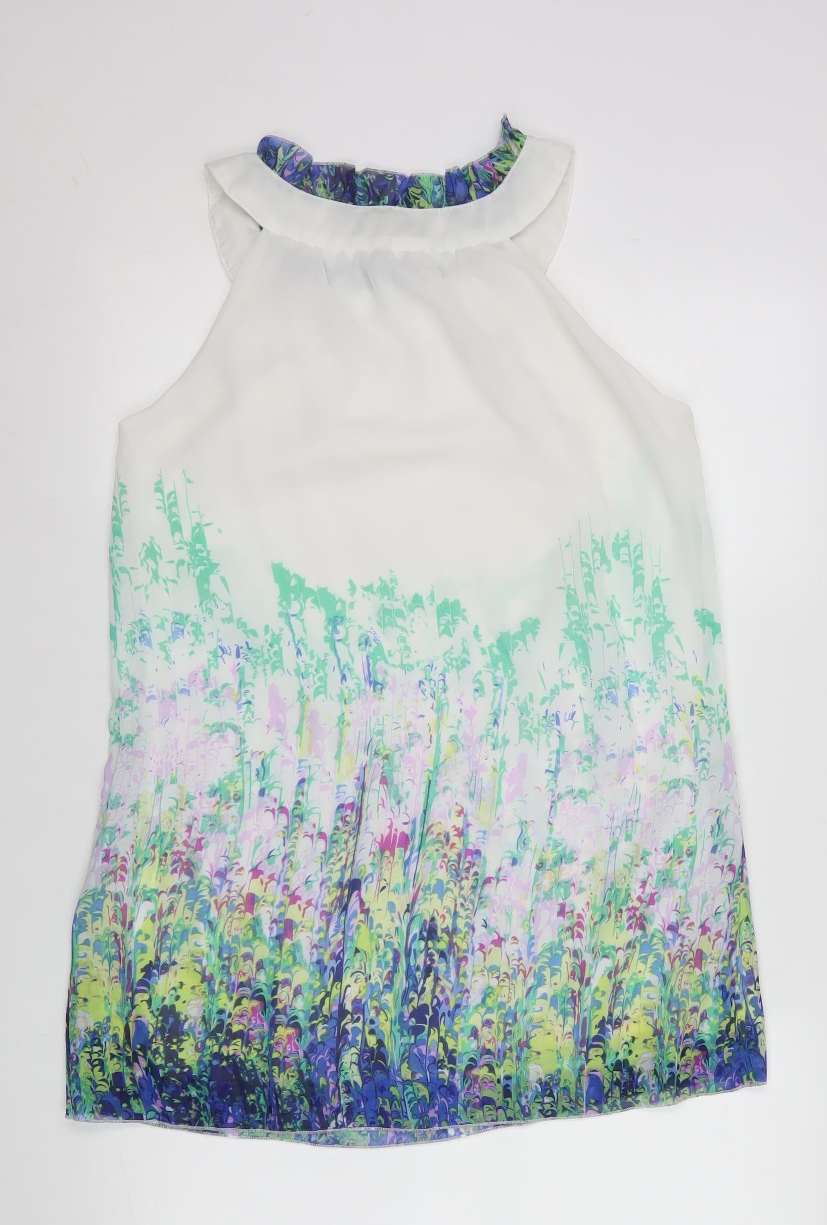 Elevate your warm-weather style with this stunning Pussycat London women’s halter blouse, featuring a beautiful multicoloured floral print that transitions effortlessly from day to evening wear. The blouse showcases a soft white base that fades into a vibrant garden of purple, green, and aqua tones, exuding a fresh and sophisticated look ideal for spring and summer occasions. The halter neckline is accentuated with a delicate ruffle trim, adding femininity and a touch of playful charm. Designed in a lightweight chiffon fabric, this sleeveless cami top drapes beautifully, offering both comfort and elegance.Crafted entirely from polyester, the blouse is breathable and easy to care for, perfect for casual days, holidays, parties, or cocktail events. The pullover closure ensures a smooth fit, while the regular cut offers a flattering silhouette suited to various body shapes. Its airy, flowy texture and sleeveless design make it an excellent choice for layering or wearing as a standalone statement piece.Pair this Pussycat London camisole with tailored trousers for a chic office look, or team it with jeans or a skirt for a relaxed weekend outfit. The lightweight nature of the fabric ensures comfort in warmer months, and its vibrant print ensures you’ll stand out in effortless style. Whether you’re dressing for a daytime brunch or an evening get-together, this floral halter blouse brings a breath of elegance and a pop of colour to any wardrobe.Maintained in excellent used condition with no visible flaws, this pre-loved blouse has been gently worn and remains in superb shape. A must-have piece for any fashion-conscious woman seeking affordable, stylish versatility from a trusted brand known for feminine flair and quality fabrics.