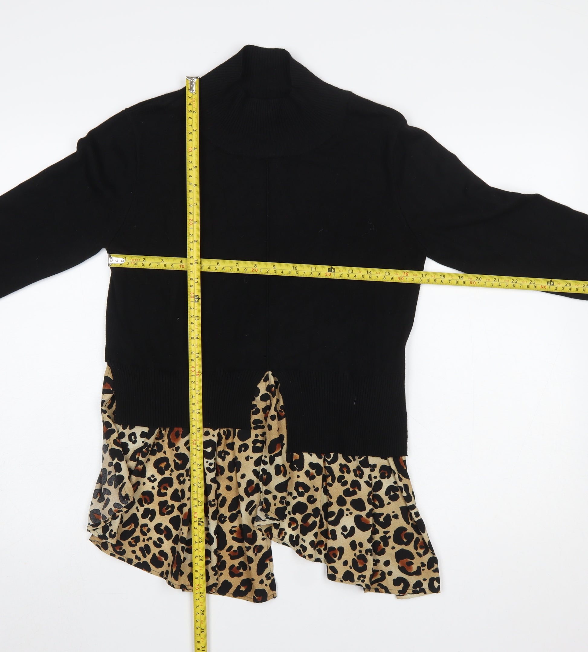 Women's Black Leopard Ruffle Roll Neck Jumper Size S