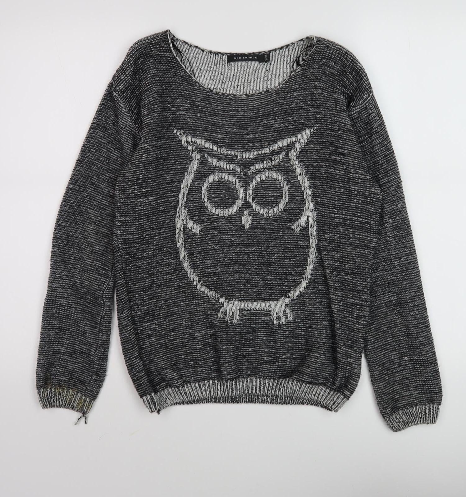 Embrace the eclectic charm of this QED London Women's Grey Owl Knit Jumper, perfect for adding a touch of whimsy to your wardrobe. Featuring a cute and classic owl motif on a backdrop of cosy chunky-knit fabric, this pullover sweater effortlessly blends style with comfort. Its soft acrylic construction ensures warmth and ease, making it an ideal choice for both autumn and winter outings. The round neckline and regular fit flatter your figure, offering a casual yet trendy look suitable for various occasions. Despite minor wear at the cuffs, this jumper maintains a good condition and is ready to find a new home where its unique character can shine. Whether pairing it with your favorite jeans for a weekend coffee run or dressing it up with a skirt for a relaxed office look, this QED London piece is a versatile addition to any sartorial enthusiast's collection. Don't miss out on making this eye-catching jumper a staple item, as it promises to deliver style and coziness in equal measure. Add this charming piece to your clothing line-up today and enjoy the perfect mix of playful design and practical warmth that it offers.