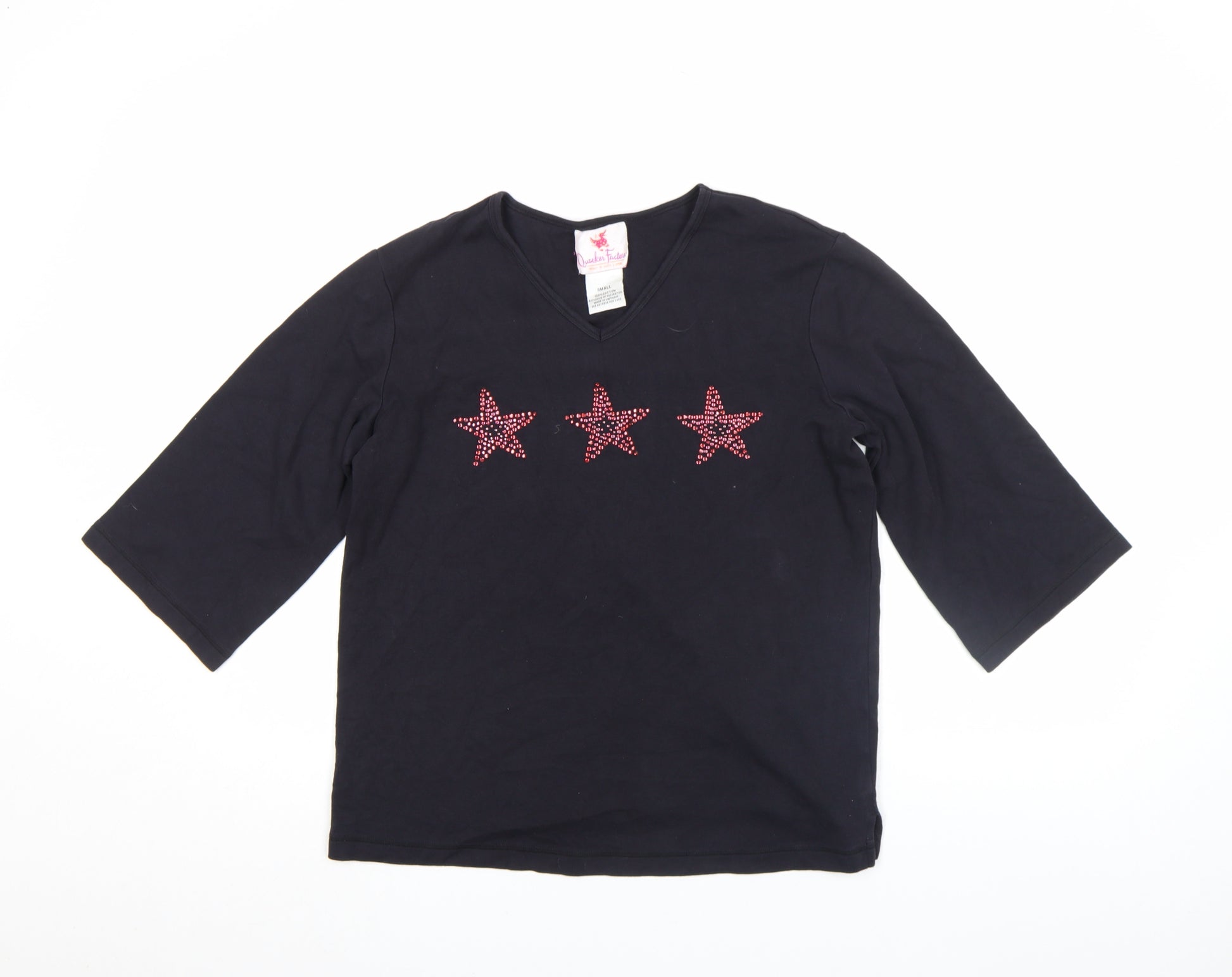 Women's Black Rhinestone Star V-Neck 3/4 Sleeve Cotton T-Shirt Size S