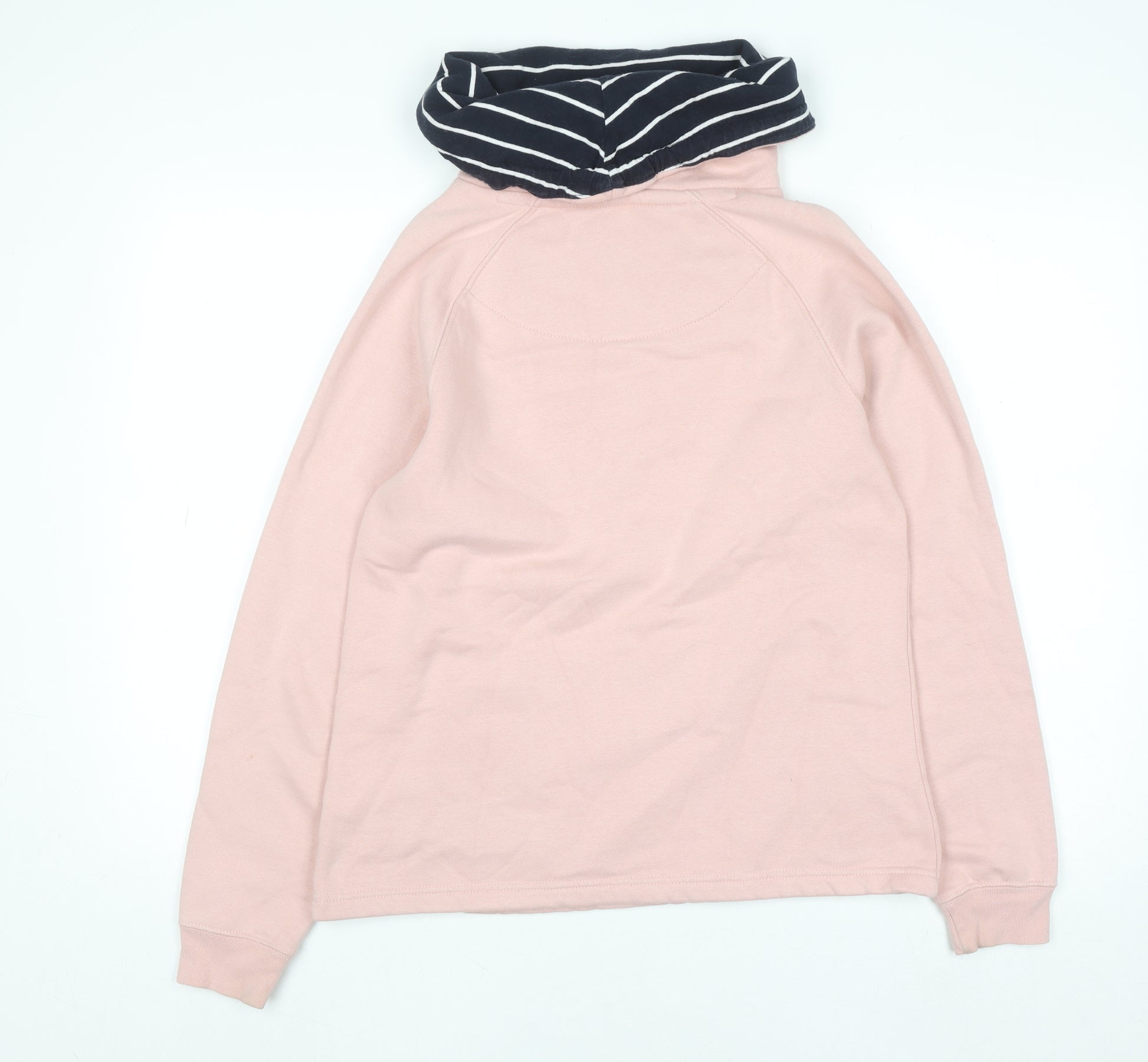 Add a touch of nautical-inspired charm to your casual wardrobe with this lovely Quba & Co women's pullover hoodie. Designed in a soft blush pink colour, this hoodie embodies modern comfort with a classic British maritime look. It is crafted from a high-quality blended fabric of 74% cotton and 26% polyester, providing both breathability and warmth. The hoodie features a stylish navy and white striped cowl neck with a drawstring fastening that gives it a distinctive coastal aesthetic while allowing adjustable comfort. Two front pockets with striped detail lining add both practicality and a subtle design contrast, perfect for keeping hands warm or storing small essentials. The ribbed cuffs and hem ensure a snug fit, maintaining its shape wear after wear. The long sleeves and midweight fabric make it ideal for layering between seasons, whether you’re heading for a seaside stroll or relaxing on a cool evening. With its relaxed yet feminine silhouette, this piece complements denim jeans or casual skirts effortlessly. The front features an embroidered logo chest accent for a tasteful touch of brand identity that’s refined, not overstated. The inside is lined with a soft fleece texture for added comfort and a cosy feel. Perfect for autumn and spring, this hoodie offers a great blend of style and practicality for everyday wear. Produced by Quba & Co, a brand known for its dedication to British nautical heritage, this pullover is the perfect choice for women seeking relaxed coastal style that doesn’t compromise on quality. In excellent pre-owned condition, this piece shows minimal signs of wear. A staple addition to any wardrobe, this Quba & Co hoodie offers timeless design and easy care convenience — simply machine washable for everyday use.