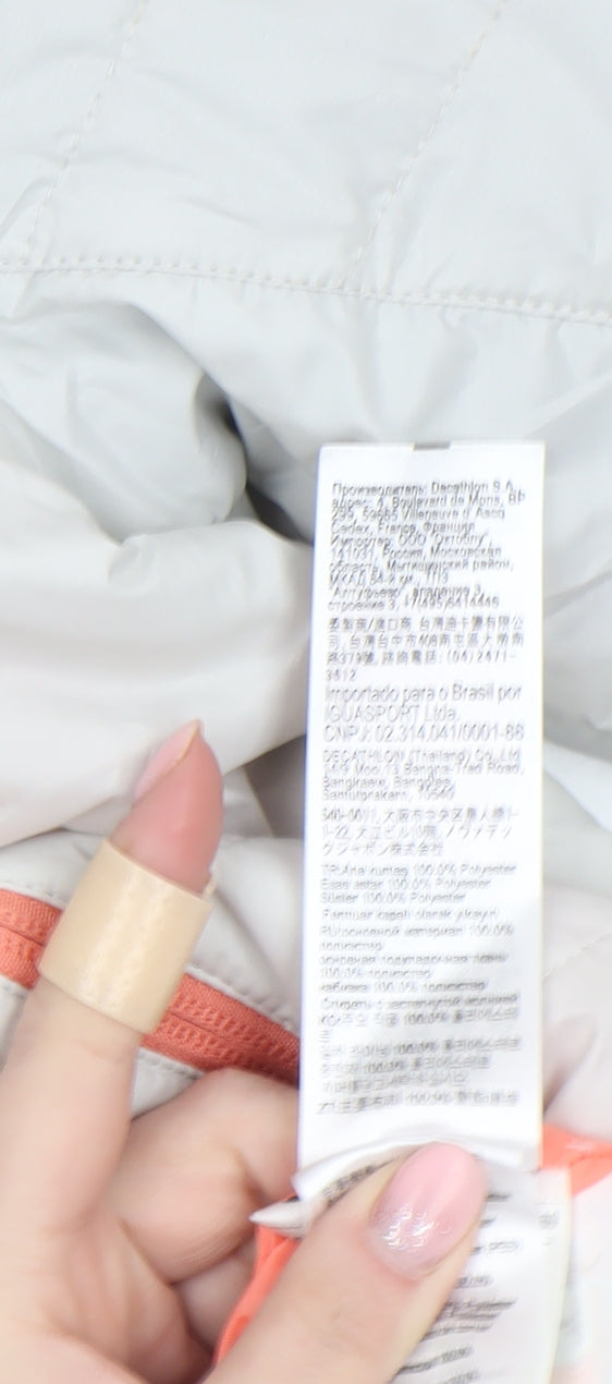 Keep your young explorer warm and comfortable with this Quechua Girls Ivory Hooded Puffer Jacket in size 12 Years. Designed for active outdoor days, this stylish and practical jacket offers lightweight insulation and a sleek, modern appearance. Crafted from 100% polyester, it provides durability and softness while maintaining excellent insulation to keep your child cosy during cooler months. The full zip fastening makes it easy to put on or take off, and the two front zipped pockets provide safe storage for small essentials. A hood adds an extra layer of warmth and protection from wind or light rain, making it ideal for both everyday wear and adventure outings. Combining functionality and comfort, this mid-length puffer jacket is perfect for autumn and winter seasons. The inner lining enhances warmth, while the breathable microfibre fabric ensures a comfortable fit without bulk. Its ivory tone is accented with coral zips and subtle blue trims, offering a stylish pop of colour that makes it stand out while remaining versatile enough to match any outfit. The quilted structure, lined body, and regular fit provide unrestricted movement and a snug feel suited to school days, outdoor walks, and travel. Perfect for hiking, walking, or layering up on chilly days, this Quechua jacket embodies practicality and design excellence from one of Decathlon’s trusted outdoor brands. With its easy-care, machine washable fabric, everyday maintenance is simple. Although gently used, it remains in excellent condition with no signs of wear, ensuring the next owner enjoys both warmth and style. A wonderful wardrobe addition for girls who love spending time outdoors while keeping snug and stylish, this Quechua Puffer Jacket delivers dependable quality and charm whether on the playground or on a nature trail.