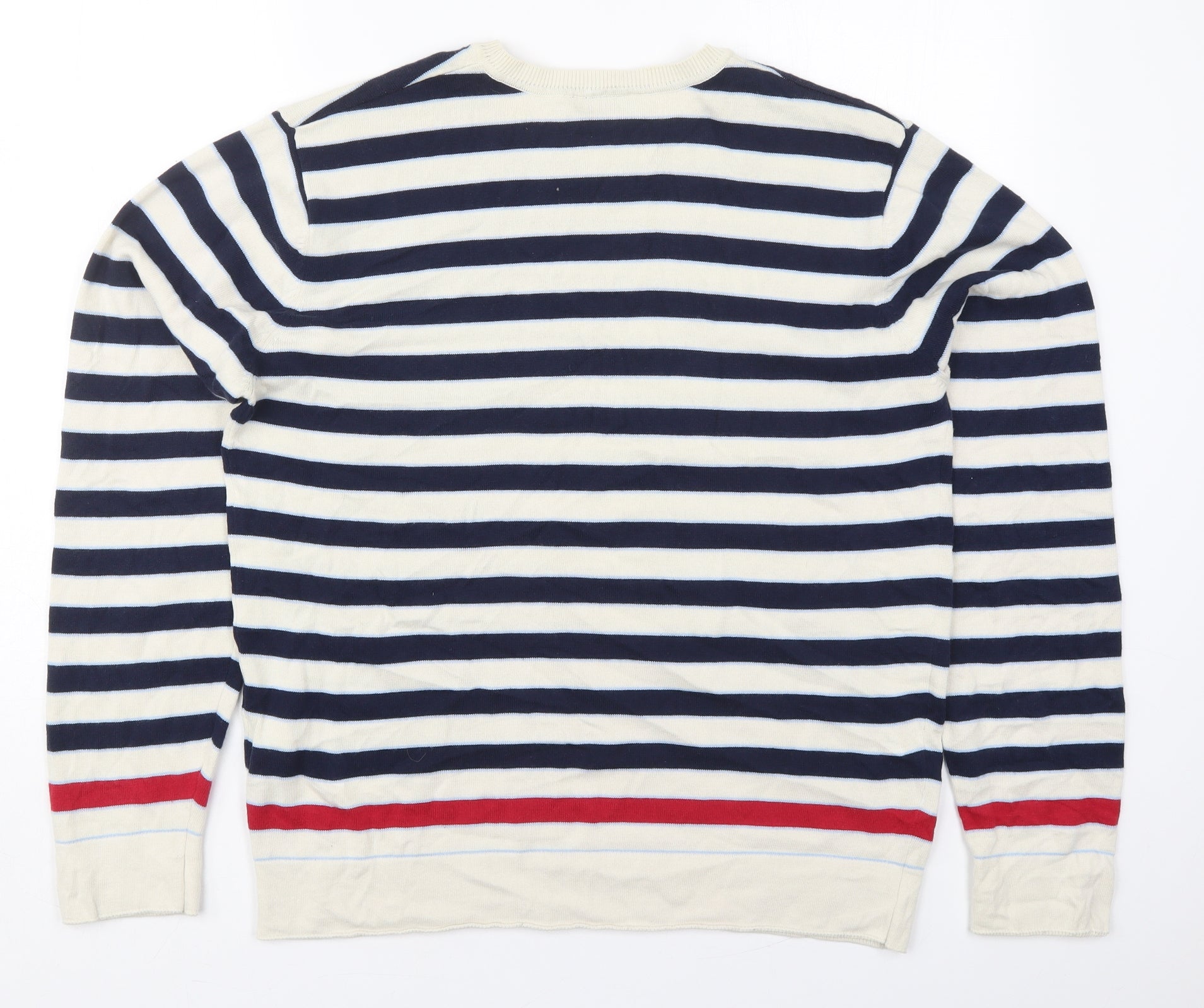 Mens Blue Round Neck Striped Cotton Pullover Jumper Size L