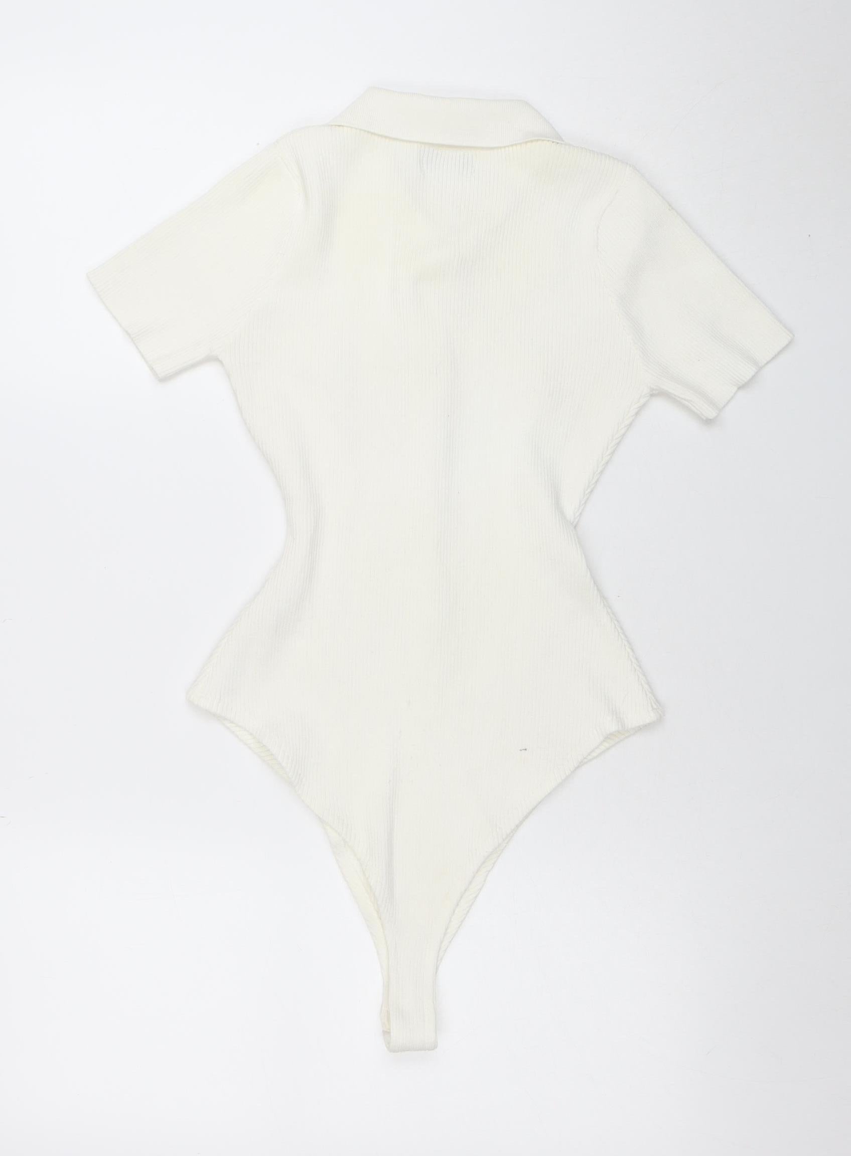 Women Ivory Ribbed Short Sleeve Collared Button Bodysuit M