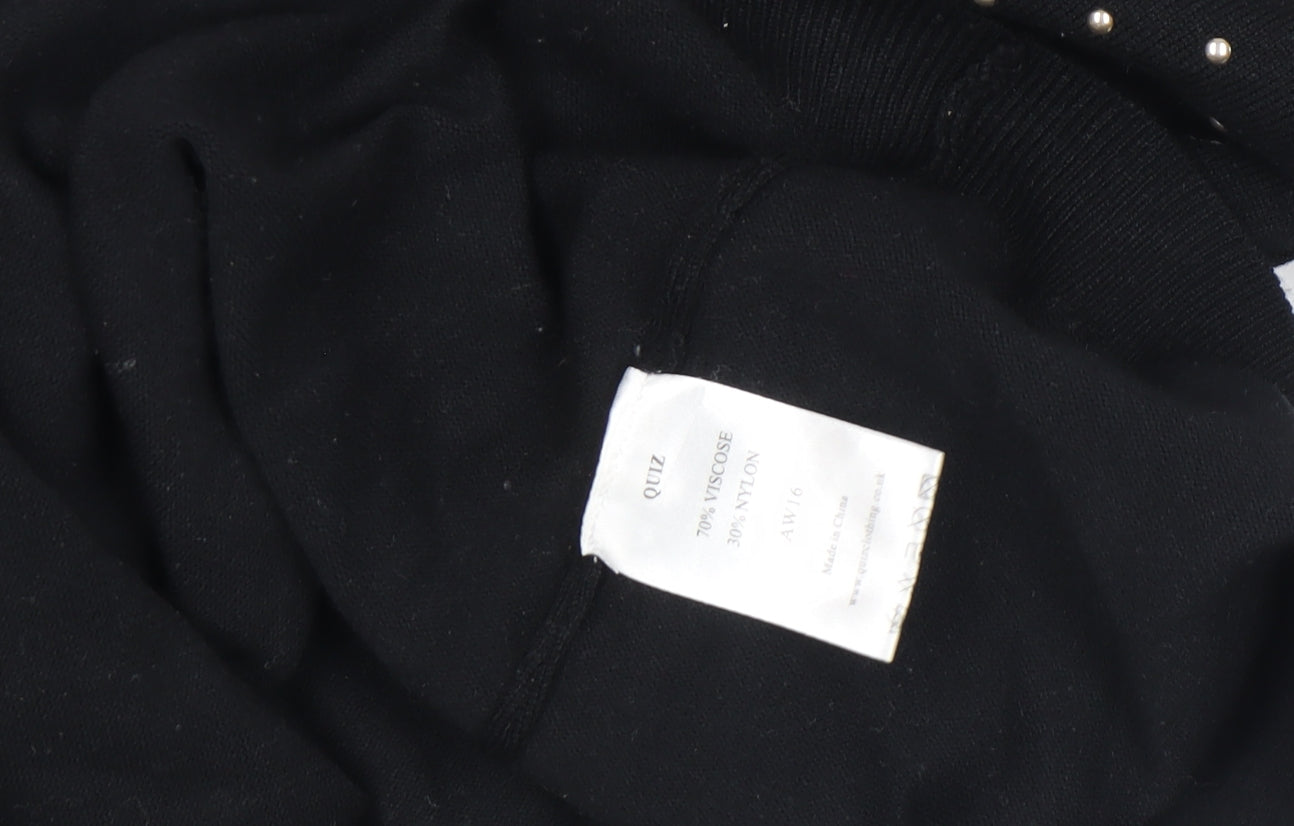 Elevate your smart casual wardrobe with this elegant black knit top from Quiz. Crafted from a soft and stretchy viscose and nylon blend, it offers both comfort and a sleek silhouette. Designed for women, this long sleeve roll neck top features stylish cold shoulder cut-outs and is embellished with delicate bead detailing across the front, creating a chic and fashionable look that transitions seamlessly from day to night. The fitted design flatters the figure, while the lightweight knit fabric makes it perfect for layering throughout the autumn and winter seasons. Its pullover style ensures easy dressing, and the subtle sparkle of the beads brings a touch of glamour to any outfit. Pair it with tailored trousers for a polished work ensemble, or with skinny jeans and heels for an effortlessly sophisticated evening look. In very good pre-owned condition, this versatile piece shows minimal signs of wear and maintains its original shape and embellishments. A fabulous addition to any fashion-forward wardrobe, this Quiz beaded black cold shoulder top offers both comfort and style for every occasion. Perfect for casual gatherings, cocktail events, or simply adding a trendy edge to your everyday wear, this top combines a timeless roll neck silhouette with contemporary detailing for a distinctive finish that never goes out of style.