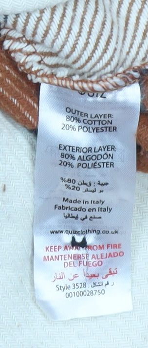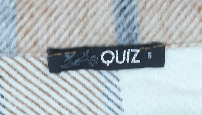 Stay stylishly warm in this chic Quiz Women’s Brown Check Flannel Shacket Jacket in size Small. Crafted from an 80% cotton and 20% polyester blend, it combines the softness and breathability of cotton with the durability and shape retention of polyester, making it ideal for transitional weather. Designed in a modern 'shacket' style—a cross between a shirt and a jacket—this piece is perfect for layering over light knitwear or a tee for a relaxed yet polished everyday look. This mid-length button-up jacket features an all-over plaid check pattern in warm shades of brown, cream, and beige, offering a timeless and versatile aesthetic. The collared neckline adds structure, while the long sleeves and button cuffs ensure comfort and functionality. Two front flap chest pockets elevate the design with a casual utility touch, making it practical for both day outings and informal evening gatherings. The flannel-like fabric enhances warmth and comfort without feeling bulky, making it an excellent choice for autumn and winter wear.The jacket comes in excellent condition with only minimal signs of wear, reflecting its gentle previous use. Its regular fit ensures ease of movement and a flattering silhouette suitable for various body shapes. Whether paired with jeans and ankle boots for a casual day out or worn open over a dress for a laid-back layered look, this Quiz checked shacket delivers effortless contemporary charm.Perfect for women who appreciate practicality paired with on-trend style, this shacket merges comfort, warmth, and fashion seamlessly. From countryside walks to weekend brunches, it’s the ultimate throw-on-and-go piece to complete your cold-weather wardrobe. Add a touch of rustic flair and smart-casual appeal to your outfit lineup with this versatile and easy-care piece that’s both fashionable and functional.