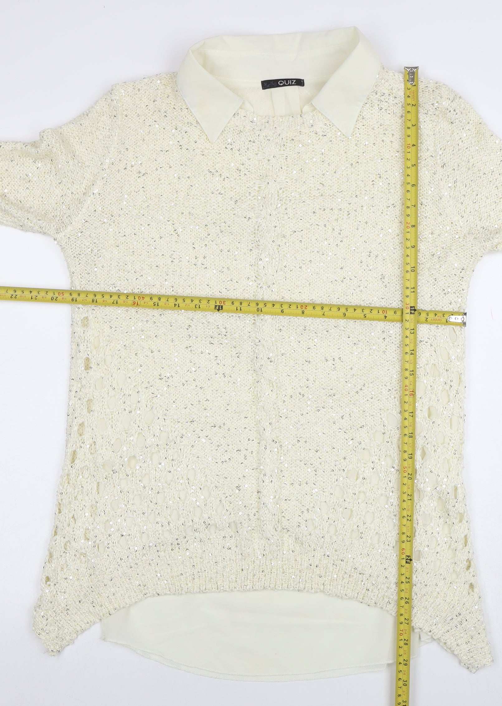 Elevate your cold-weather style with this elegant ivory pullover jumper from Quiz. Crafted from a soft blend of polyester and acrylic, this lightweight knit features a charming open-knit design embellished with subtle sequins, giving it a touch of sparkle that stands out for casual days or evening gatherings. The collared neckline and layered shirt hem effect create a fashionable, preppy look that works seamlessly with jeans, leggings, or a chic skirt. Designed in a flattering regular fit, this long-sleeve jumper offers both comfort and style, making it perfect for cooler autumn and winter days. The back cut-out detailing adds an eye-catching touch to modernise the classic pullover silhouette, while the lightweight feel ensures easy layering. Ideal for casual outings, coffee dates, or festive occasions, this versatile piece transitions effortlessly from day to night. In excellent pre-loved condition with light signs of wear but no damage, this jumper is ready to bring a stylish new addition to your wardrobe. Perfect for women who appreciate elegant detail and comfort combined, this Quiz collared knit ensures you look polished and feel great wherever the day takes you. Add a touch of contemporary sparkle and sophisticated design to your wardrobe staple collection with this stunning ivory sequin-knit pullover from Quiz. A timeless addition that pairs effortlessly with your favourite trousers or skinny jeans to create a chic, coordinated ensemble that turns heads every time.