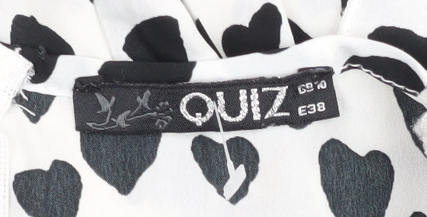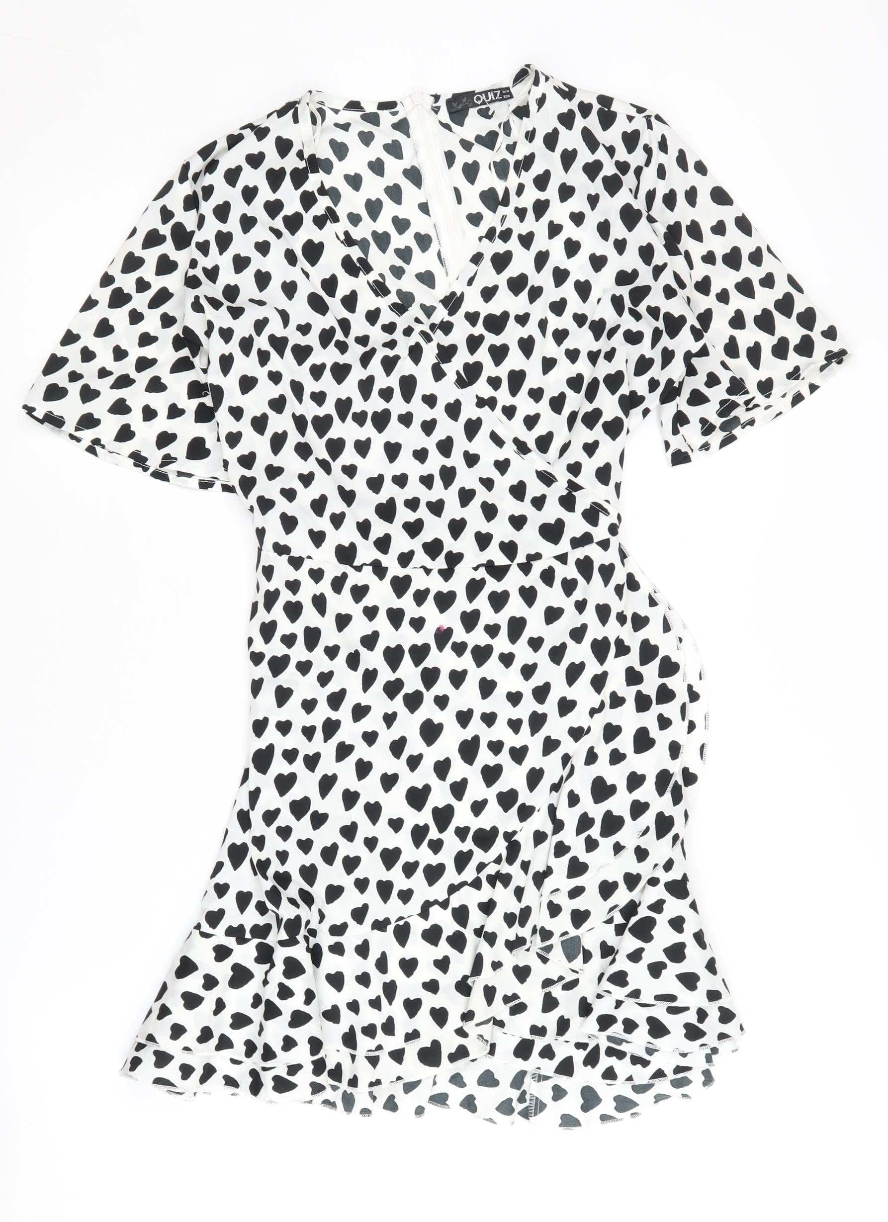 Step out in style with this eye-catching Quiz Women's White Heart Print Wrap Dress. Perfect for party or cocktail occasions, this dress combines playful elegance with a touch of romance. Made from soft 100% polyester, it promises a comfortable and flattering fit. The black heart pattern against a crisp white background adds a charming twist, while the V-neckline and short sleeves offer a timeless appeal. Featuring a ruffle accent at the hem, this versatile dress is finished with a convenient zip closure for easy wear. Despite a small pink stain, its overall condition is good, ensuring you stand out in the crowd. Ideal for women who love to make a statement, this wrap dress will be your go-to in any wardrobe.