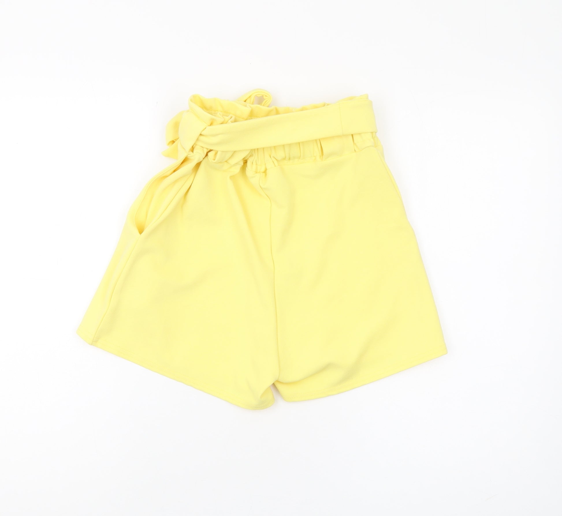 Elevate your casual wardrobe with these stylish Quiz Women's Yellow Paperbag Shorts. Crafted from a comfortable blend of 95% polyester and 5% elastane, these shorts are designed for a regular fit, perfect for sunny spring and summer days. Their cheerful yellow hue adds a pop of colour to any outfit, while the high-rise paperbag style offers a flattering silhouette. The bow-tied belt is a charming accent, allowing you to adjust the fit to your liking, ensuring you feel comfortable and chic. With a simple tie closure, these shorts are easy to wear and ideal for various casual occasions, from brunches with friends to strolls in the park. Made with lightweight fabric, these shorts promise breathability and ease of movement. Pair them with a simple top or a breezy blouse to create an effortlessly stylish ensemble. These shorts are brand new, making them a great addition to your collection. Discover the joy of wearing these versatile, eye-catching shorts that offer both comfort and fashion-forward appeal.