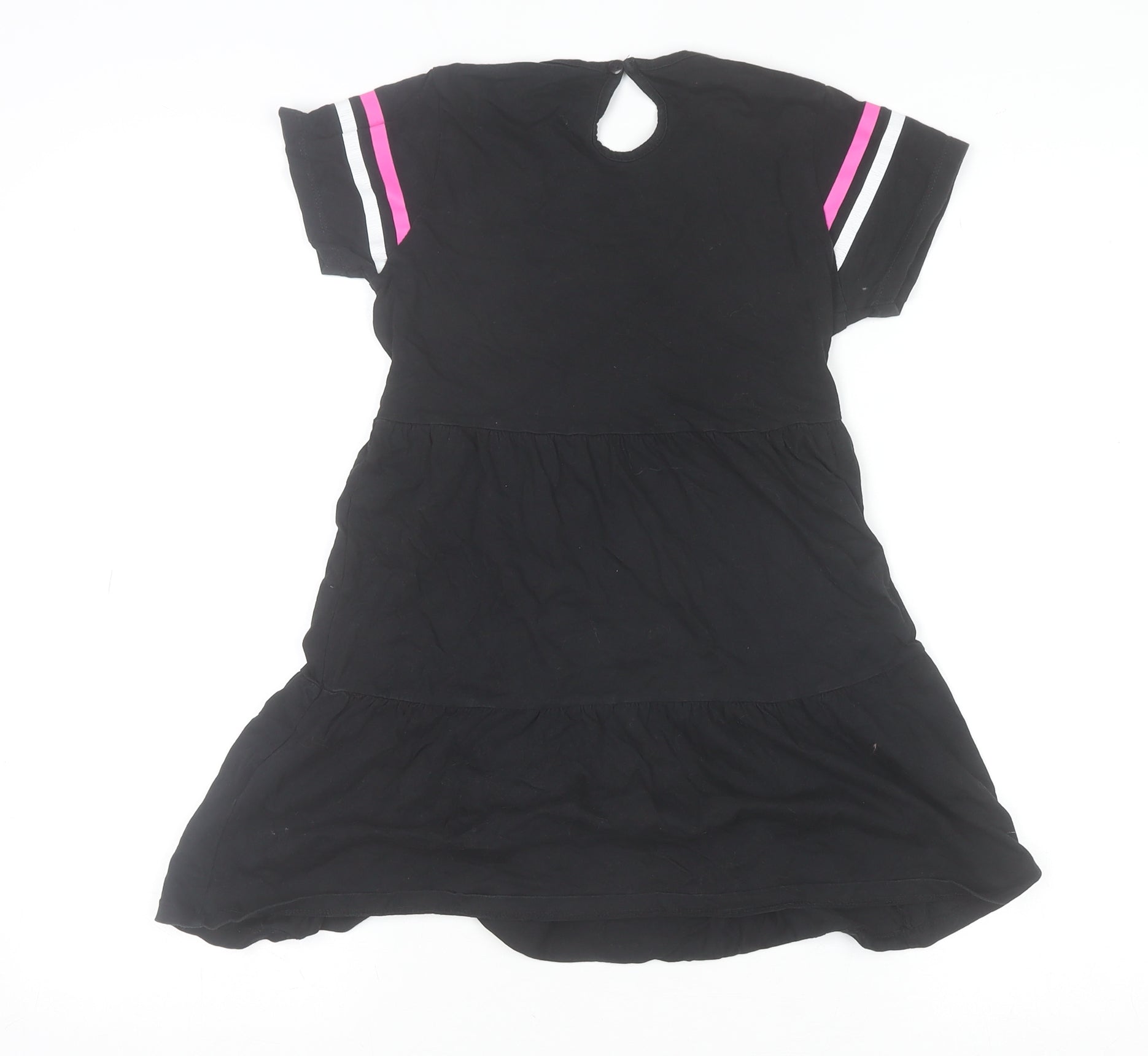 This R&B Girls' black T-shirt dress is a fun and fashionable choice for casual wear. Made from soft 100% cotton jersey, it offers breathability and comfortable movement for busy young girls. Designed in a classic T-shirt style, it features short sleeves with contrasting pink and white stripe detailing and a round crew neckline. The standout 'DON’T CALL ME Angel' graphic adds a playful, sassy touch that girls will love. The lightweight cotton makes it perfect for spring and summer days, while the easy pull-on design and button fastening at the back ensure dressing is quick and hassle-free. Falling to about knee length with a gently tiered skirt, it combines comfort with a flattering, girlish silhouette. This dress works well for day trips, school activities, or relaxed holiday outings. Pair it with trainers or sandals for an easy, trendy everyday outfit. In excellent pre-owned condition with no visible stains or damages, this dress remains fresh and ready to wear. Ideal for the fashion-forward girl who loves adding personality to her wardrobe, this piece is both versatile and durable — a practical yet stylish addition to any child’s collection. Machine washable at 30°C for easy care, this R&B cotton dress keeps its shape and colour wash after wash. Make her wardrobe playful and confident with this statement graphic dress for girls.