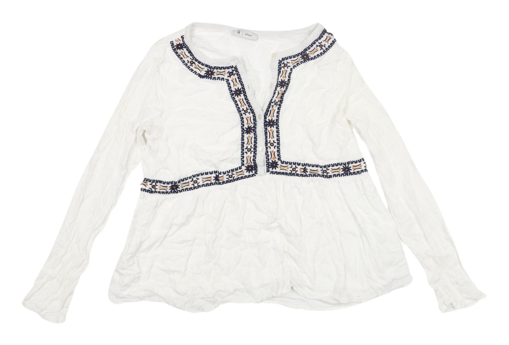 Elevate your wardrobe with this charming R édition women's blouse. Designed in a crisp white hue and featuring exquisite embroidered accents, this blouse captures the essence of bohemian chic. Crafted from soft, breathable viscose, it delivers comfort and style, making it an ideal choice for spring and summer wear. The blouse sports a classic long sleeve design with a scoop neck, perfect for casual outings or relaxed days at home. The button closure adds a touch of convenience while offering a secure fit. Its lightweight, regular fit ensures you move with ease and confidence.This versatile blouse is part of the Women's department and is styled in regular size 10, aligning with UK sizing standards. It’s machine washable, allowing for easy maintenance and care. Whether paired with jeans for a casual look or dressed up with accessories, this blouse will become a staple piece in your collection. With a solid pattern that complements the bohemian theme, this item is ideal for the free-spirited, modern woman. Dive into the effortless elegance and comfort of this R édition blouse—a testament to contemporary fashion flair.
