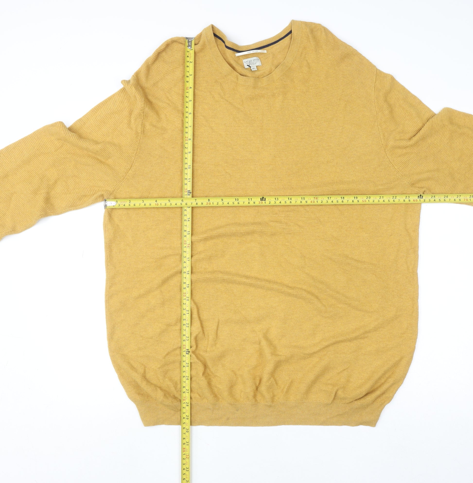 Elevate your casual wardrobe with this Racing Green men’s pullover jumper, designed in a timeless crew neck style for effortless versatility. Crafted from 100% pure cotton, it delivers exceptional softness and breathability, making it a comfortable choice for all seasons. The lightweight knit construction ensures ease of layering while maintaining a clean silhouette, perfect for pairing with jeans or chinos for a relaxed yet refined look. The warm yellow hue brings a contemporary twist to a classic style, adding a pop of colour that suits both spring freshness and autumn warmth. Designed for the modern man, this piece by Racing Green reflects the brand’s British heritage and commitment to quality craftsmanship. Featuring a snug ribbed hem and cuffs, the jumper maintains shape and offers a flattering fit that complements the body without restricting movement. The crew neckline gives it a traditional appeal, while its cotton fabrication ensures durability and easy care, being fully machine washable. Ideal for versatile wear, this jumper transitions effortlessly from casual outings to smart-casual gatherings. Whether layered over a collared shirt or worn on its own, it exudes understated style and comfort. In very good pre-owned condition, this pullover shows minimal signs of previous wear and remains in excellent wearable shape — ready to become a staple in your everyday collection. Designed with practicality, comfort, and a touch of sophistication, it’s the perfect addition for men who appreciate timeless, well-made wardrobe essentials.