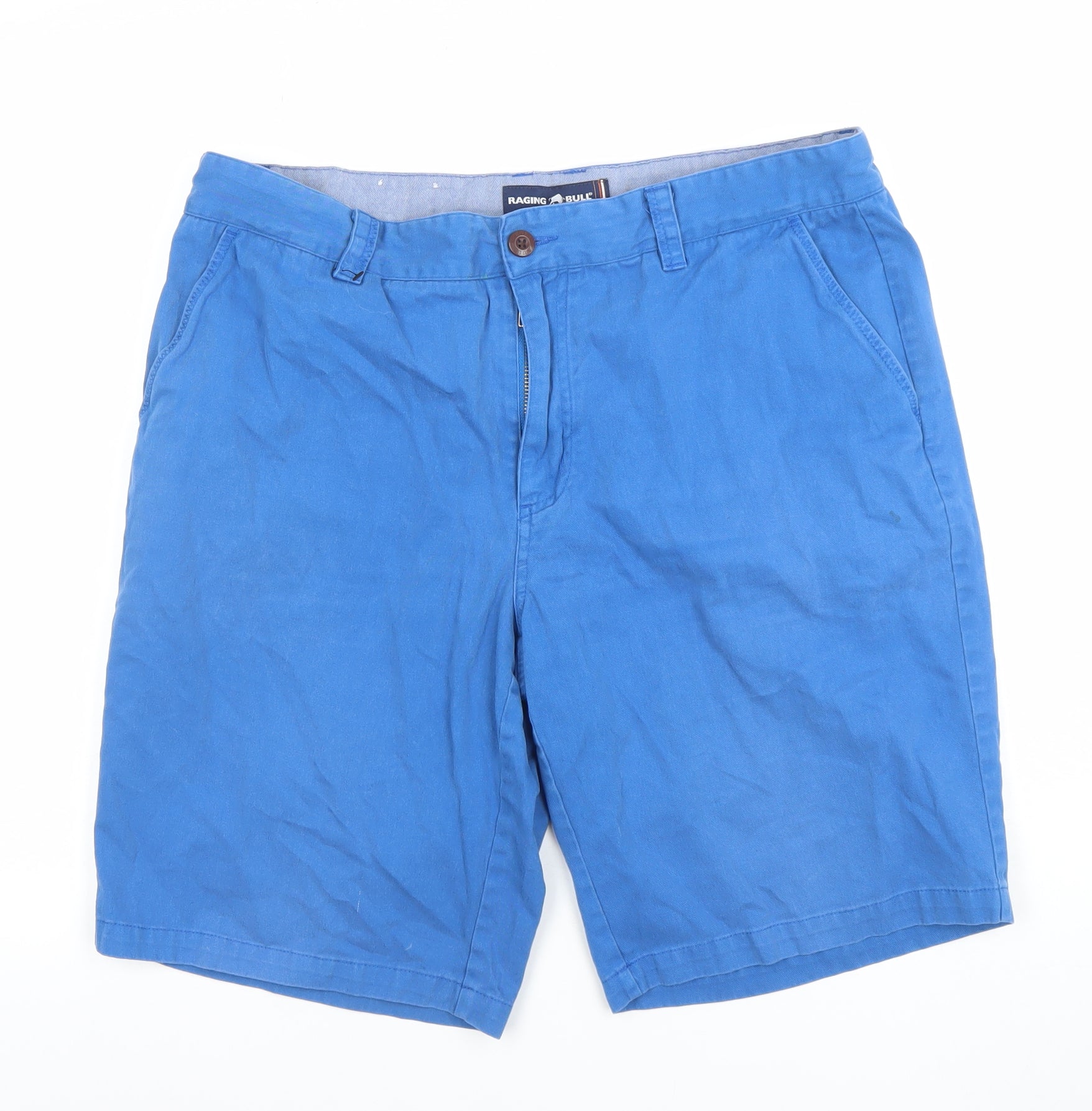 Step out in refined off-duty style with these Raging Bull men’s chino shorts, designed for effortless comfort and timeless appeal. Crafted from 100% cotton, they offer a naturally breathable and soft feel, ideal for warmer days. The strong mid-blue colour makes them a versatile addition to any modern wardrobe, pairing well with relaxed T-shirts or crisp polo shirts for an understated look. The regular fit and flat front construction ensure a flattering, comfortable silhouette that suits most body types while maintaining a smart casual appearance. Featuring classic belt loops, button and zip fastening, and functional side slash pockets, these shorts combine practicality with a clean, polished aesthetic. The back welt pockets with button detailing add a handsome finish typical of quality Raging Bull design. Perfect for casual summer days, weekend outings, or laid-back travel adventures, these chinos can easily transition from beach to barbecue. Their lightweight cotton canvas material ensures ease of movement and lasting comfort throughout the day. In very good pre-owned condition, they show only light wear and a minor mark that does not detract from their overall smart look. With their durable construction, high-quality fabric and timeless design, these Raging Bull shorts are an excellent choice for anyone seeking comfort with everyday sophistication. Whether styled with trainers or loafers, they bring both performance and style to your warm-weather wardrobe. Ideal for men who value quality and subtle detail, these shorts promise versatility for spring and summer dressing — an easygoing essential that stands out for all the right reasons.