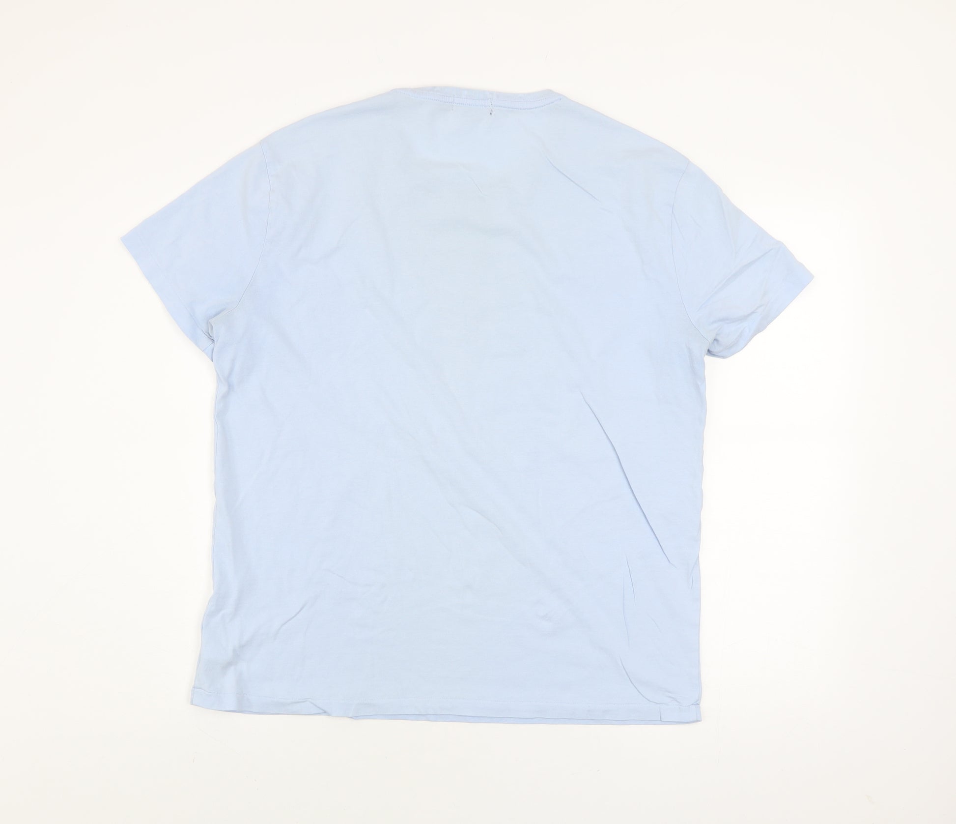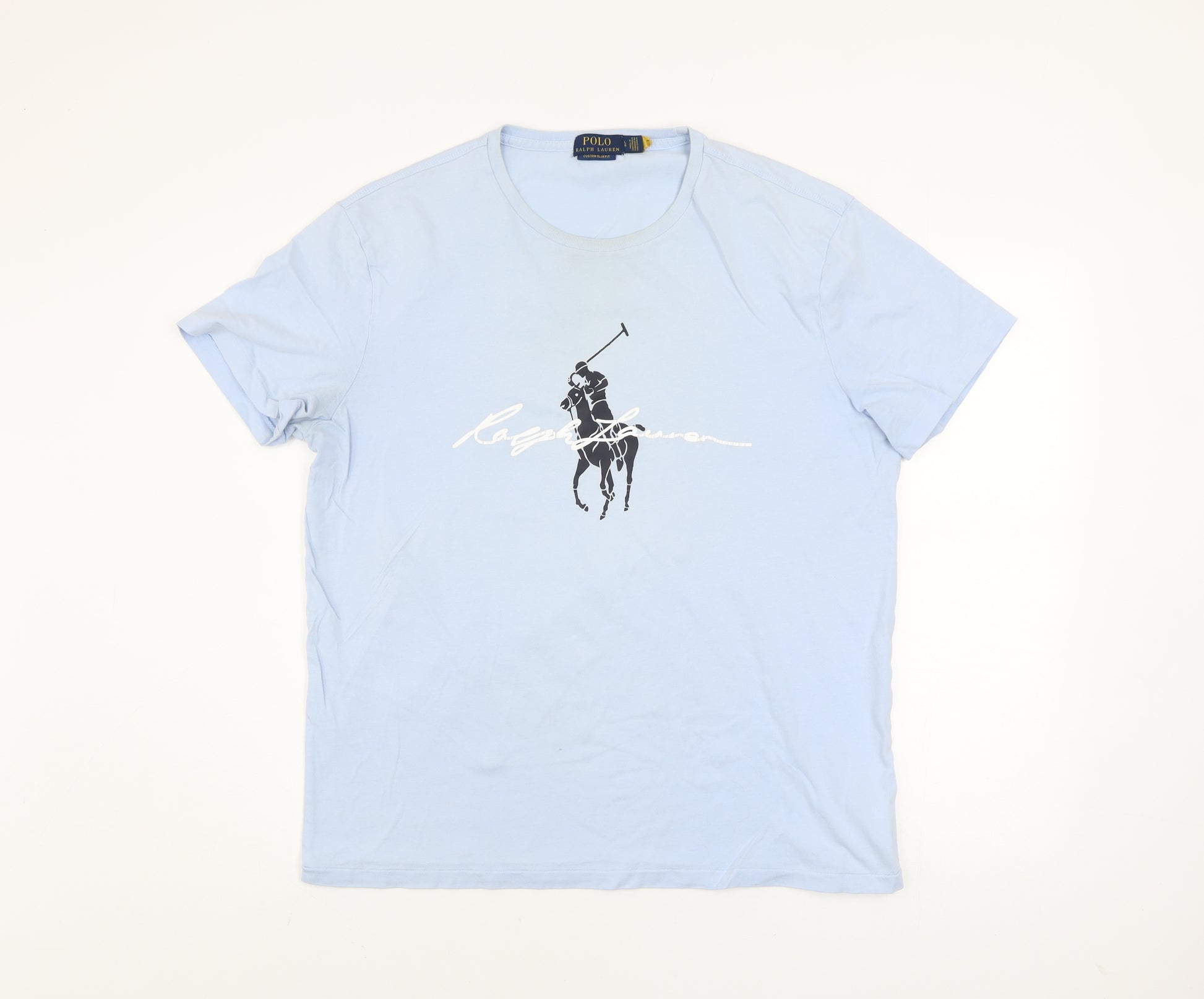 Show off effortless style and premium quality with this Polo Ralph Lauren men's T-shirt in a soft pastel blue hue. Crafted entirely from pure cotton jersey fabric, this short-sleeved crew neck tee delivers everyday comfort with a breathable, lightweight feel. Designed in the brand’s Custom Slim Fit, it strikes a flattering balance between a regular and slim cut, offering a clean, tailored silhouette ideal for casual or smart-casual looks. The iconic large Polo pony and signature script logo printed across the chest highlight Ralph Lauren’s timeless sports heritage, giving this piece a distinct designer edge. Perfect for pairing with jeans, chinos or shorts, the classic blue shade offers easy versatility through spring and summer seasons. Subtle rib detailing at the collar reinforces the neckline, ensuring shape retention wash after wash. Though previously worn, this piece remains in very good condition with only a tiny mark on the front that doesn’t detract from its smart appearance. Ideal for the modern man seeking comfort and understated luxury, this Ralph Lauren T-shirt is a wardrobe staple that embodies casual sophistication. Whether you are updating your off-duty essentials or adding a signature designer touch to weekend wear, this piece is a dependable choice for any style-conscious gentleman.