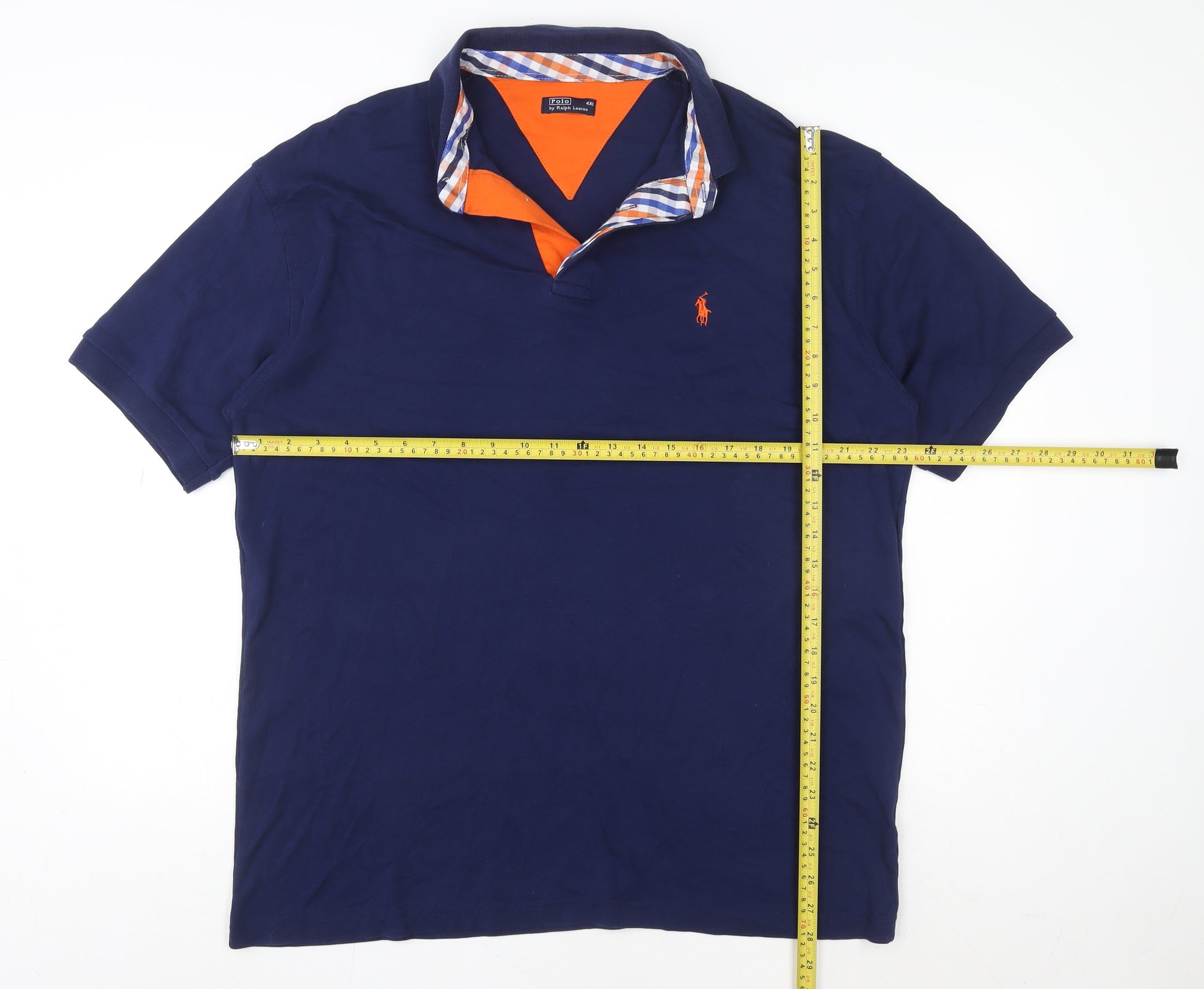 Step into timeless sophistication with this Ralph Lauren Men's Blue Cotton Polo Shirt in size 4XL. Expertly tailored from 100% soft cotton, this high-quality piece delivers classic comfort and enduring style. The deep navy-blue shade is effortlessly elevated by its orange inner placket and distinctive checked collar trim, giving it a refined yet contemporary edge. The iconic embroidered Ralph Lauren polo pony on the chest adds a dash of instantly recognisable flair, synonymous with premium craftsmanship. Designed for a relaxed, Regular Fit that flatters a Big & Tall frame, this Polo exudes both comfort and confidence. Perfect for men who value understated style, it transitions seamlessly from smart-casual settings to leisurely weekends. Lightweight and breathable, it provides excellent comfort through Spring, Summer, and Autumn, whether worn on the golf course, for casual outings, or layered under a jacket for cooler days. The short sleeves and collared neckline maintain its classic aesthetic, while the jersey fabric ensures a smooth, soft feel against the skin. This shirt is machine washable for effortless care, making it an easy go-to for everyday wear. In excellent pre-owned condition with minimal signs of wear, this piece offers exceptional value for anyone seeking premium quality without the premium price tag. Pair it with chinos for a polished look, or throw it on with jeans for laid-back style. An essential wardrobe staple that reflects Ralph Lauren’s enduring commitment to refined, comfortable menswear—ideal for those who appreciate both timeless tradition and reliable durability. Make an effortlessly stylish statement that balances casual and smart appeal in one piece.