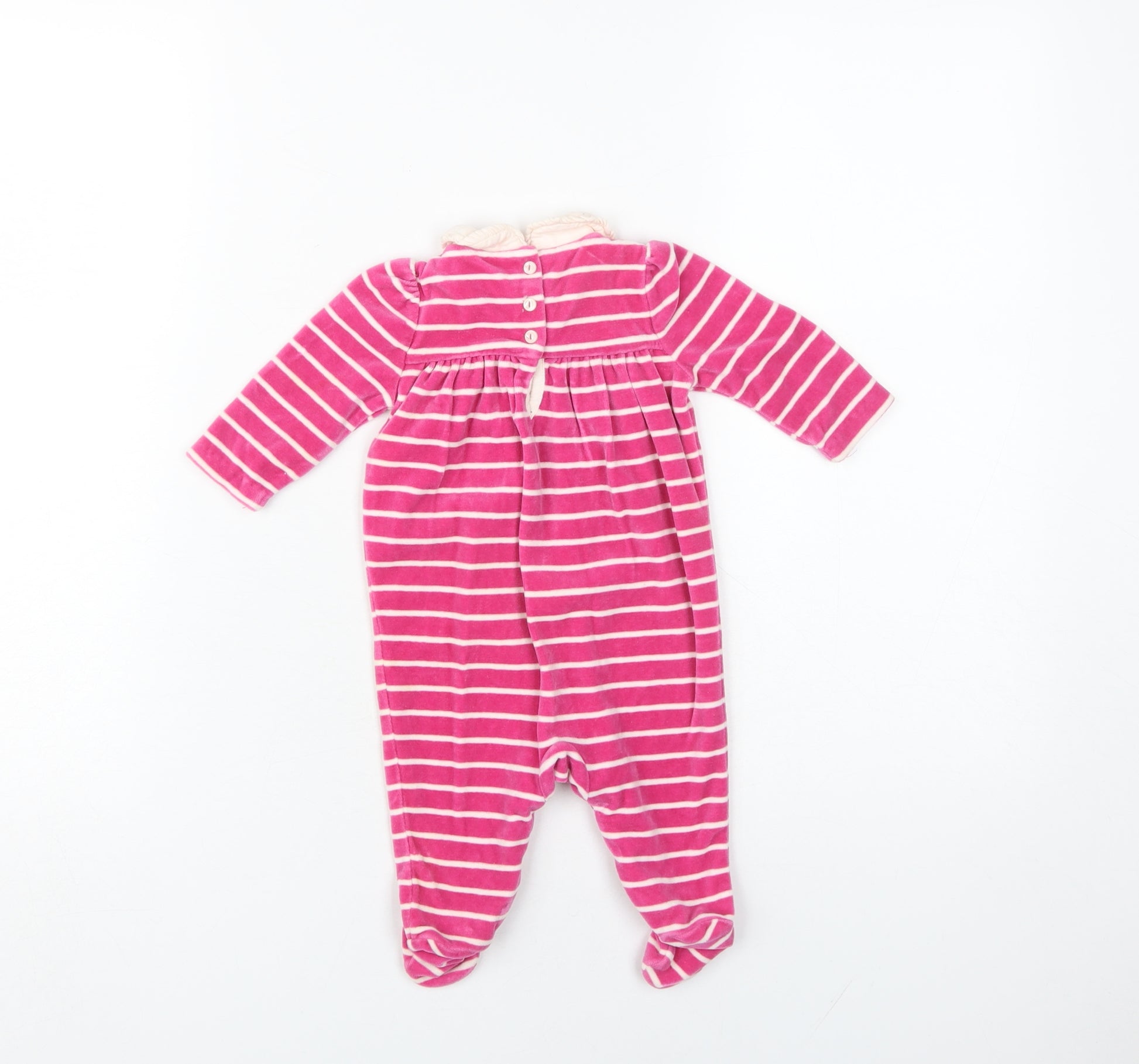 This adorable Ralph Lauren baby grow in a delightful pink and white stripe pattern is perfect for your little one. Designed with comfort and style in mind, this one-piece suit offers a Peter Pan collar and charming bow accents. Crafted from 100% cotton velvet, it ensures a soft touch against your baby’s skin while being machine washable for easy care. The button closure makes changing effortless, and the long sleeves add warmth, making it suitable for all seasons. Ideal for casual wear, this garment is excellent in condition and ready to be loved. It's a versatile addition to your baby's wardrobe, perfect for everyday adventures or as a thoughtful gift.