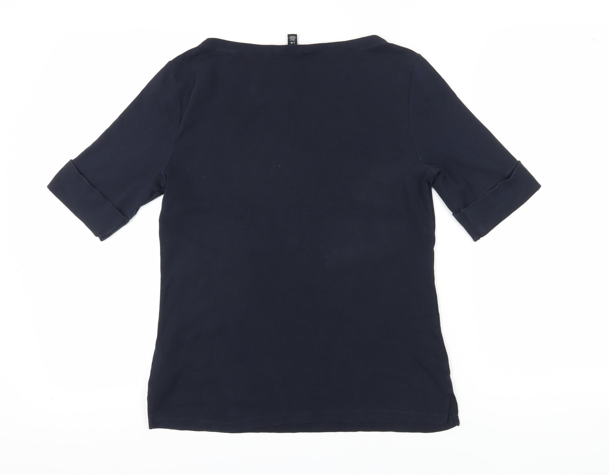 Enhance your wardrobe with this elegant Ralph Lauren women's top. This classic black piece comes in a comfortable size Large, making it perfect for any casual occasion. The top features a sophisticated boat neckline and classic fitted short sleeves, providing a flattering silhouette for all body types. Made from a high-quality blend of 94% cotton and 6% elastane, it ensures a comfortable fit while maintaining its shape. The solid black colour is perfect for layering or wearing on its own, offering versatility whether you're dressing up for a day out or lounging at home. Machine washable for easy care, this top combines style and convenience. Its simple yet chic design makes it a staple piece that can be easily integrated into any wardrobe. With a regular fit and careful crafting synonymous with Ralph Lauren, this piece promises both comfort and a touch of luxury. Grab this versatile top today and add a classic touch to your outfits.