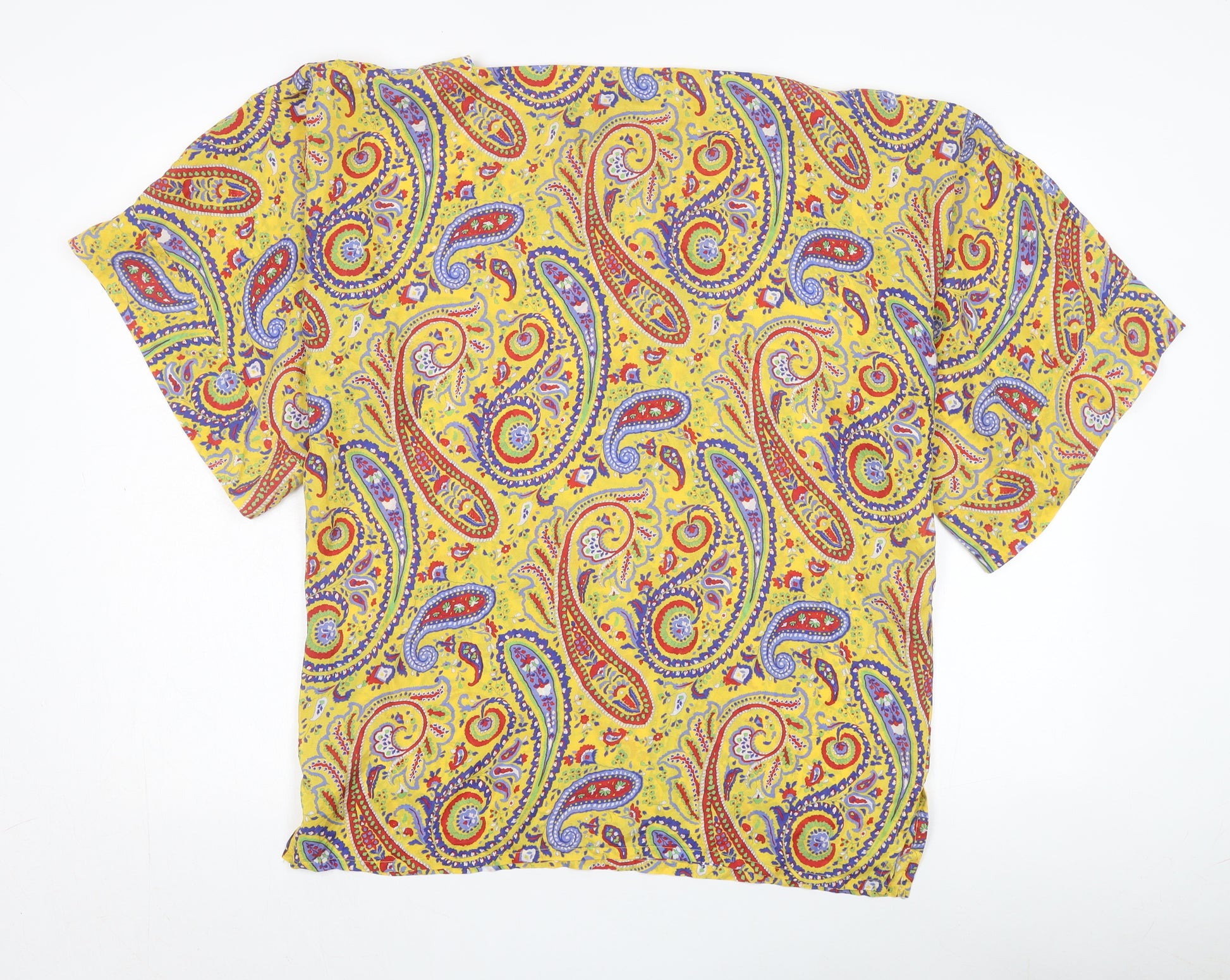 Elevate your spring and summer wardrobe with this stunning Ralph Lauren blouse in a vibrant yellow paisley print. Crafted from luxurious silk, this blouse offers a silky-smooth feel against your skin, making it an elegant choice for both casual outings and special occasions. The boat neckline and 3/4 kimono sleeves provide a contemporary yet classic touch, while the pullover style ensures easy wearability. This regular fit blouse is designed to offer both comfort and style, making it a versatile piece for any fashion-forward woman. Ideal for pairing with your favourite jeans or skirts, the paisley pattern adds a pop of colour and sophistication to your ensemble. Whether you're heading to a lunch date or a casual day out, this Ralph Lauren piece is sure to turn heads. Its excellent condition and high-quality fabric make it a worthwhile investment for any wardrobe. Enjoy the timeless elegance of Ralph Lauren with this unique silk blouse.