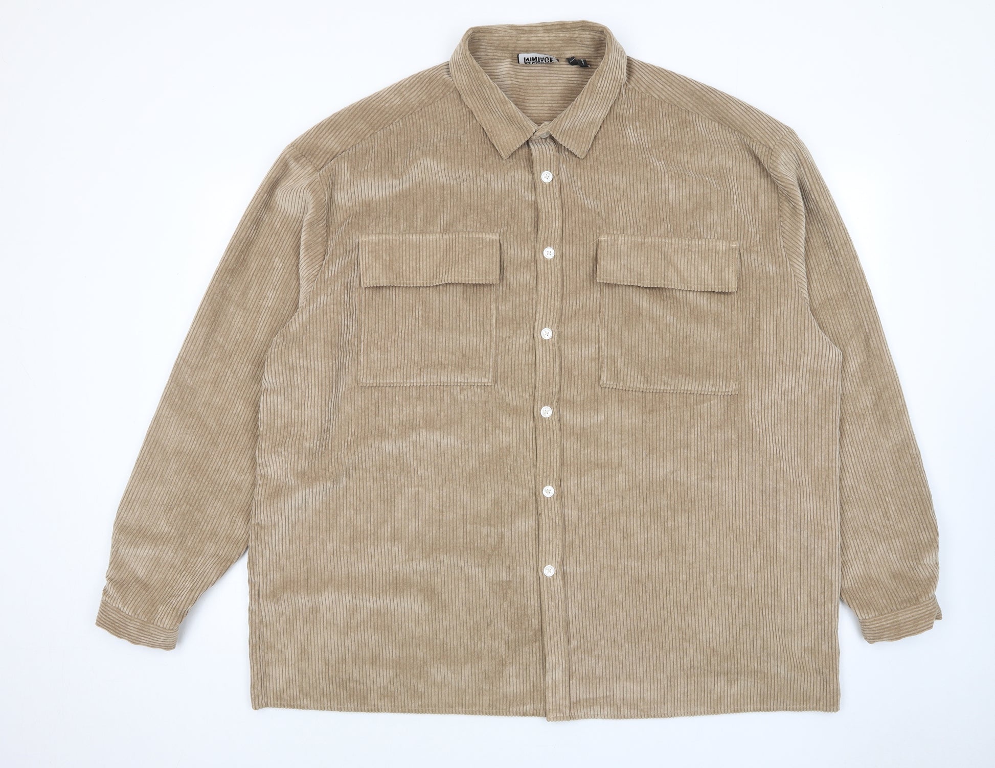 Mens Brown Polyester Button-Up Size XL Collared Button - Pockets