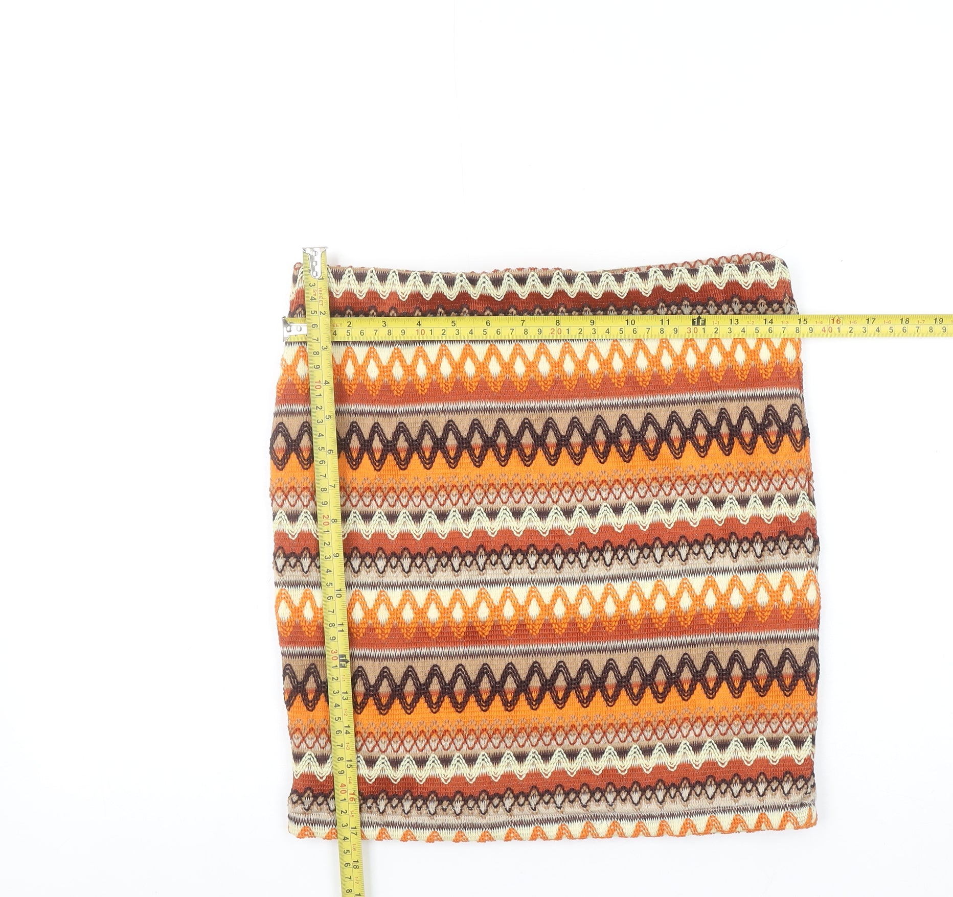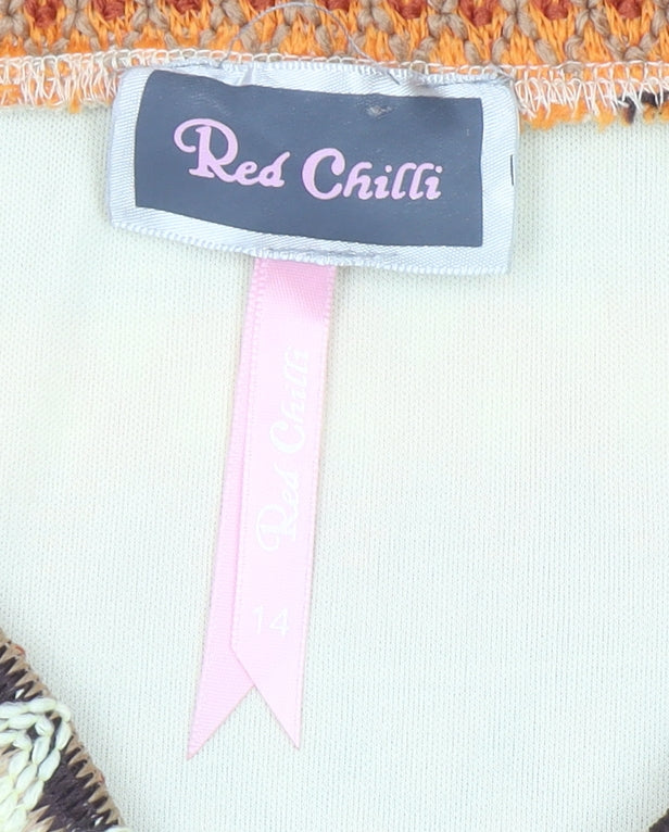 Add a splash of retro charm to your wardrobe with this striking Red Chilli women's mini skirt. Featuring a bold geometric pattern in warm tones of orange, brown, beige, and cream, this skirt captures an effortlessly bohemian vibe perfect for day-to-night wear. The short length gives it a flirty, modern edge, ideal for pairing with fitted tops or cosy knits. Designed in a stretchy knit fabric made from 92% polyester and 8% elastane, it offers a comfortable fit with just the right amount of flexibility for everyday wear. The skirt is fully lined for added comfort and durability, ensuring it maintains its flattering shape. This versatile piece can be styled easily for casual outings or dressed up for a party look, making it a great addition to any wardrobe. Whether teamed with boots and tights during autumn or sandals in summer, it transitions seamlessly across seasons. The Red Chilli brand is known for its fun, vibrant, and youthful styles that make a confident fashion statement. This one is no exception, boasting both comfort and trend appeal. In excellent pre-owned condition, the skirt shows only minimal signs of wear with no stains or damage visible. Perfect for fashion lovers seeking a pop of colour and pattern, this skirt will elevate even the simplest outfit. A must-have for anyone who enjoys mixing vintage-inspired charm with a modern silhouette. Grab this stylish and comfortable piece at a fantastic value, ready to brighten your wardrobe with its vivid design and flattering fit.