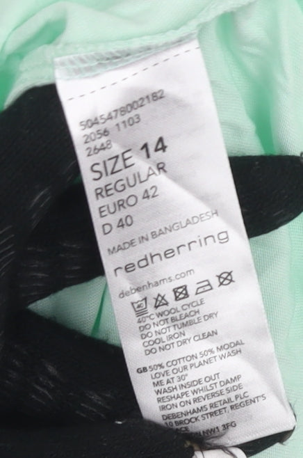 This delightful women's T-shirt from Red Herring offers both style and comfort in a simple design. Sized at 14 and crafted for regular fit, it's perfect for everyday wear. Made from a lightweight blend of 50% cotton and 50% modal, this T-shirt ensures both softness and durability, making it ideal for warm spring and summer days. The gentle green hue of the fabric presents a refreshing look, while the solid pattern complements any casual ensemble. Featuring a classic round neck and short sleeves, it's designed for ease and versatility. Easy to care for, this T-shirt is machine washable, ensuring you can wear it as often as you like without worry. Although slightly wrinkled, it's in excellent condition and comes from a well-known brand, ensuring quality. This T-shirt is an all-around great choice for anyone seeking comfort and style in their casual wardrobe.