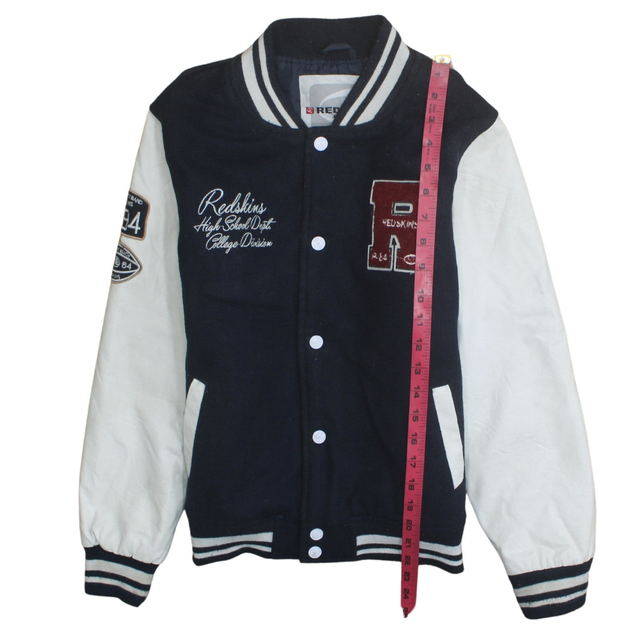 Add a sporty, collegiate look to your child’s wardrobe with this classic Redskins Boys Varsity Jacket. Designed in a traditional blue and white colourway, this stylish jacket effortlessly channels an all-American college aesthetic. The jacket features a soft, woven polyester outer shell and smooth polyester lining to provide warmth and comfort during the cooler months of autumn and winter. With its high-quality embroidered Redskins ‘R’ patch and detailed College Division lettering, this piece stands out with authentic varsity charm.The jacket includes button fastenings along the front, ribbed collar, cuffs, and hem with striped detailing for a snug, flexible fit. Practical side pockets offer space for small essentials or simply to keep hands warm. Made from durable materials, this outerwear is both sturdy and easy to care for, being machine washable. Ideal for everyday casual wear, school days, or layers on outdoor strolls, its comfortable fit and timeless style make it a wardrobe favourite.The design balances sporty detail with comfort—perfect for boys who love a laid-back yet trendy look. The jacket’s embroidered accents, collared neckline, and lined structure add durability and shape retention. As part of the Redskins Junior line, it embodies quality craftsmanship and a youthful spirit.Condition-wise, this piece remains in excellent pre-owned shape, showing only minimal signs of previous use, with no visible stains, holes, or fading. The fabric retains its rich colour, and buttons are firmly intact. No original retail tags are present, but overall, it looks well cared for, ready to wear straight away.Whether styled over a hoodie or simple T-shirt, this varsity jacket adds a confident finishing touch to any boy’s outfit. With its authentic American-inspired design and everyday practicality, this Redskins Boys Varsity Jacket is a fashionable and functional piece that brings sporty flair to autumn or winter outfits. Perfect for young trendsetters seeking comfort, quality, and standout style.