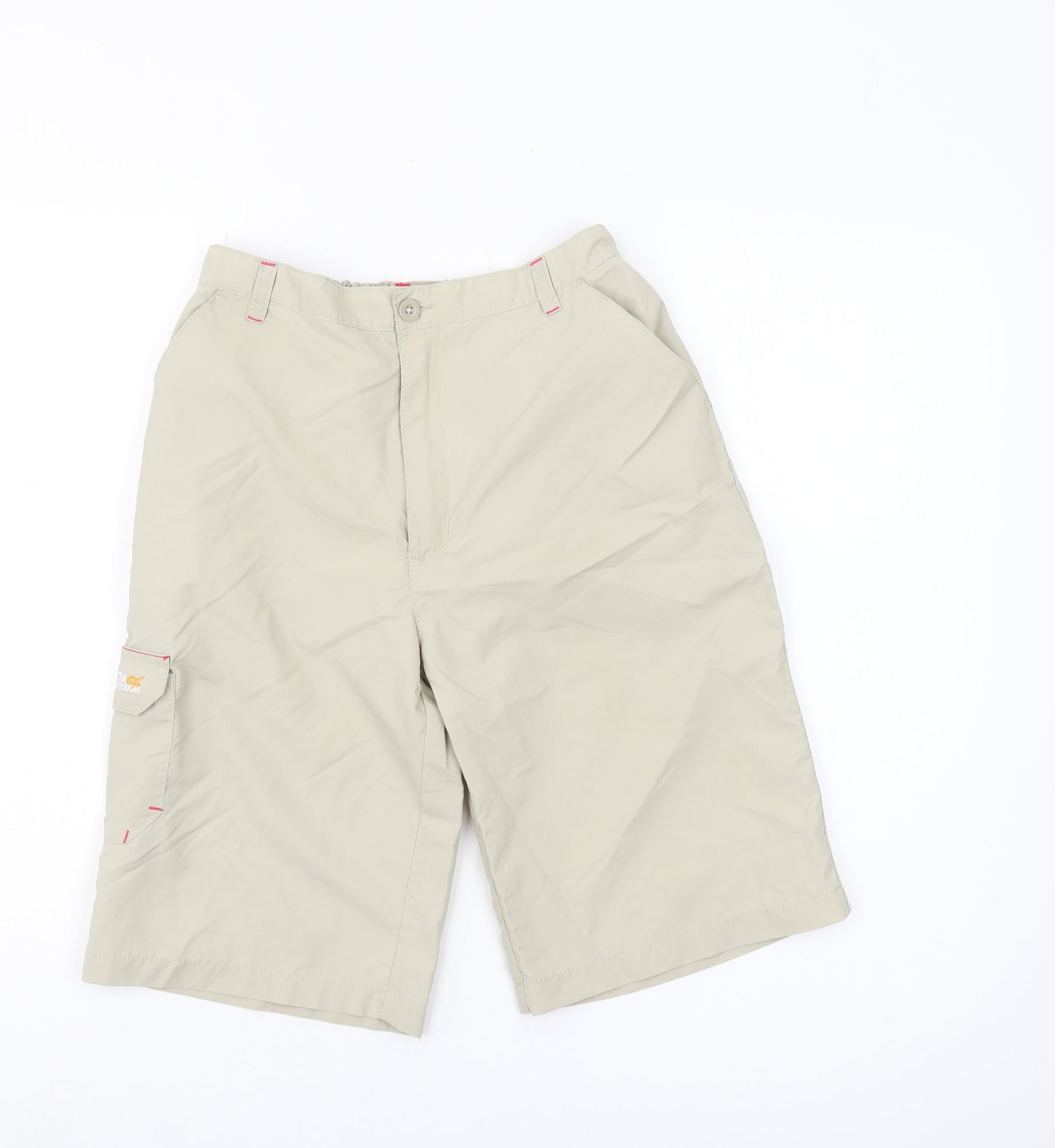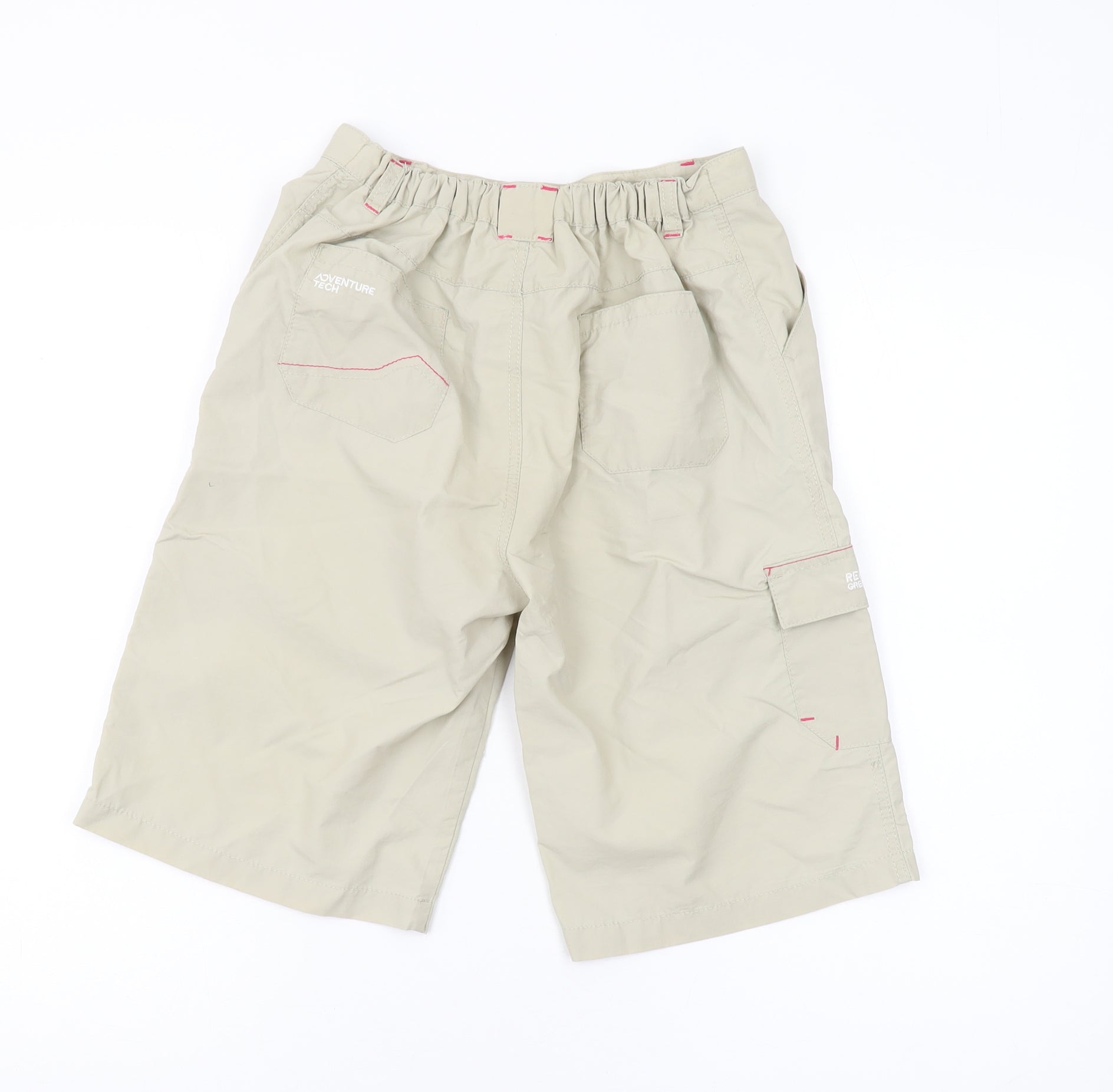Prepare your young adventurer for outdoor escapades with these Regatta Boys Beige Cargo Shorts. Perfectly blending comfort and functionality, these cargo shorts are an ideal choice for spring and summer adventures. Crafted from durable nylon fabric, they are built to withstand active play and exploration. The material composition of 100% polyamide ensures a lightweight and breathable experience, keeping your child comfortable in warm weather.Designed with practicality in mind, the shorts feature multiple pockets, providing plenty of space for carrying essentials. The adjustable and elastic waist ensures a snug fit, allowing for easy movement during hiking or walking activities. The flat front style adds a sleek look, while the beige colour offers versatility, making it easy to pair with a variety of tops.These shorts are not only perfect for outdoor activities but also for casual outings and travel. The mid-rise design provides additional comfort, and the light fabric wash complements the outdoor theme with a natural, relaxed appearance. Machine washable, these shorts are easy to care for, making them a practical addition to any young explorer's wardrobe.Whether it's for a school trip or a family hike, these Regatta Boys Beige Cargo Shorts deliver convenience and style. With a flattering regular fit and reliable zip closure, these shorts promise not only to meet but exceed expectations in functionality and design.