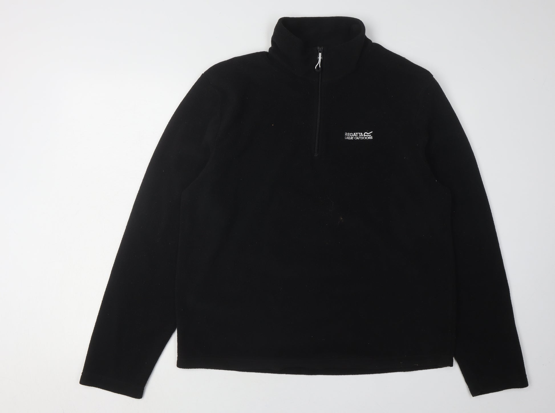 Elevate your outdoor wardrobe with this Regatta Men's Pullover Sweatshirt in sleek black. Designed for those cool autumn and winter days, this sweatshirt offers the perfect blend of style and functionality. Crafted from 100% polyester fleece, it ensures comfort and warmth, making it ideal for hiking or casual outings. The high neckline with a 1/2 zip closure provides adjustable coverage, while the signature Regatta logo adds a touch of brand authenticity. Featuring a clean, no-pattern design and built-in graphic print accents, this pullover is easy to pair with any outfit. Despite some visible wear marks, its overall condition remains good, offering reliable performance for the avid outdoor enthusiast. Machine washable and easy to care for, this sweatshirt is a practical addition to any active wardrobe. Don't miss the opportunity to own a piece from Regatta, synonymous with quality outdoor apparel.