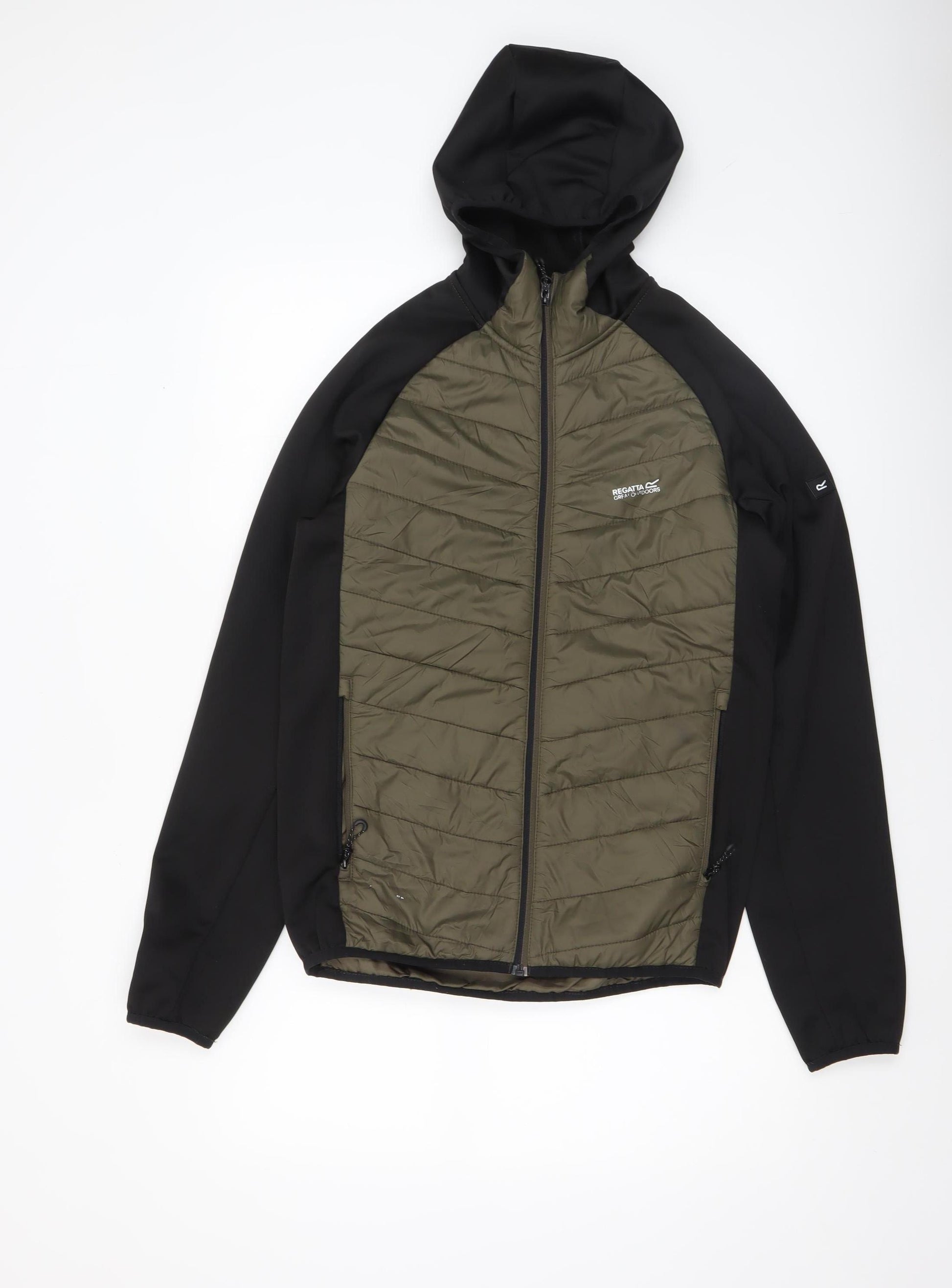 Stay ready for the outdoors with this Regatta men's softshell jacket, perfect for layering during cooler days. Designed for functionality and versatility, this piece combines durable polyamide and polyester fabrics with a flexible elastane blend, giving you dependable protection and freedom of movement. The two-tone colour scheme with olive green panels and black sleeves offers a practical yet stylish look suited for hiking, walking, travelling, or everyday casual wear. The jacket’s softshell style ensures light insulation and resistance against wind, while the padded front panels provide extra comfort and warmth without added bulk. The full zip front closure makes it easy to wear, and the hood gives added protection from unexpected weather. Two zipped pockets at the front are ideal for keeping essentials safe and within reach. Made from high-quality Regatta outdoor performance materials, the soft yet durable construction guarantees lasting use. Its lined interior enhances warmth, while the water-resistant and windproof outer maintains comfort while moving outdoors. Machine washable for easy care, this jacket is a reliable, low-maintenance piece every man needs in his wardrobe. In excellent used condition with no visible damage or marks, it retains a fresh and clean appearance with minimal signs of wear. Whether you’re exploring outdoors, commuting, or simply out for a weekend stroll, this Regatta Softshell Jacket is built for practicality and style. A dependable layer that delivers comfort and function, this men’s size S jacket is perfectly suited for autumn, spring, or mild winter seasons—a must-have for those who value performance without compromising everyday style.