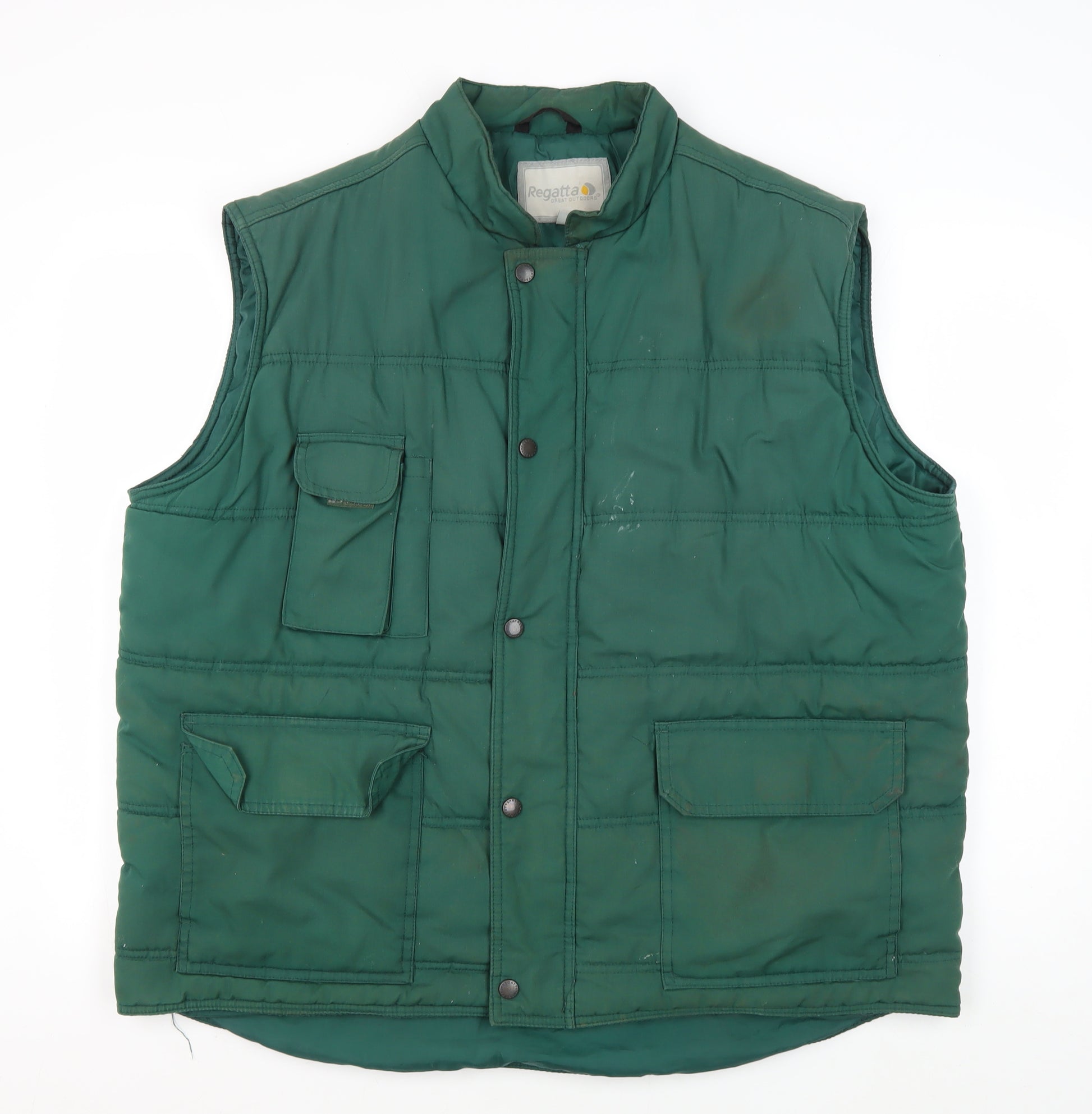 Stay warm and stylish during the colder months with this Regatta men's waistcoat. Crafted in a classic green hue, this piece is designed for comfort and practicality. Made from a quality blend of 65% polyester and 35% cotton, it combines durability with breathable comfort, ideal for outdoor activities. The waistcoat features a stand-up collar style and handy pockets, offering both versatility and functionality. With a snap closure, it is easy to put on and take off, offering convenience throughout your day. Perfect for casual occasions, this waistcoat fits regularly, ensuring a comfortable wear. It has no visible pattern, keeping the design simple and minimal. Though it shows signs of wear, particularly on the front, it maintains its character and charm, making it a valuable addition to your wardrobe. Great for autumn and winter seasons, this waistcoat provides additional warmth with its polyester insulation. Don this piece when heading out for an outdoor adventure or simply when running errands around town. A practical choice for any man who values style and comfort.