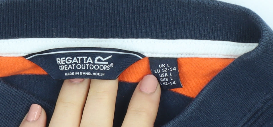 Refresh your casual wardrobe with this Regatta Men's Multicoloured Striped Polo Shirt in size L. Designed for easy comfort and everyday wear, this polo shirt features wide horizontal stripes in striking orange, navy and white, giving it a classic yet eye-catching look. Crafted from soft and breathable 100% cotton jersey fabric, it ensures all-day comfort whether you’re heading outdoors for a walk, relaxing on a weekend, or catching up with friends. The collared neckline with button placket adds a refined touch, while the lightweight material provides a relaxed, regular fit suitable for layered or standalone wear. Practical and easy to care for, it’s fully machine washable and made with durable stitching for lasting quality. The embroidered Regatta Great Outdoors logo on the sleeve reinforces the premium outdoor heritage of the brand, making this polo both stylish and functional. Ideal for spring, summer, and autumn wear, it’s perfect for outdoor activities, travel, or relaxed casual settings. In very good pre-loved condition with only minor signs of gentle wear, this polo is a reliable wardrobe staple for any man who values comfort, practicality, and style. Pair with jeans or shorts for an effortlessly smart-casual look. A great value Regatta piece to add to your everyday rotation.