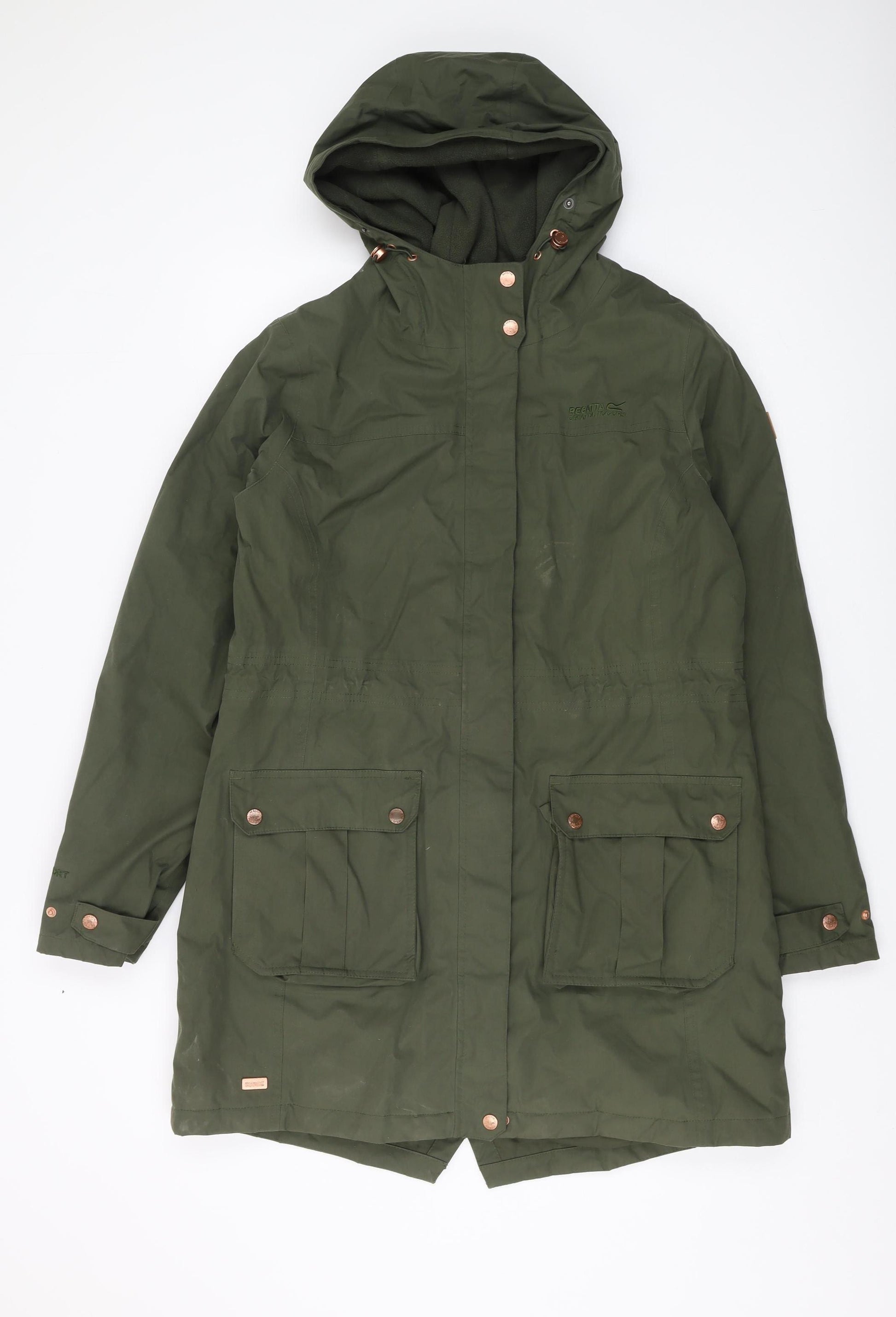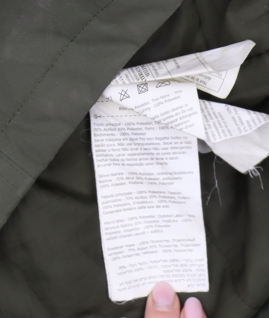 Discover the perfect blend of style and functionality with this Regatta Women's Green Parka Jacket, designed for both comfort and sophistication. Ideal for the colder months, this long-length parka is crafted entirely from durable polyester, ensuring you stay warm and protected against the elements. Its rich green hue adds a touch of elegance to your outdoor adventures, while the hooded feature and ample pockets enhance practicality. The parka’s regular fit is flattering for any figure, making it an essential addition to your autumn and winter wardrobe. Whether you're heading for a casual stroll or engaging in outdoor activities, this jacket's zip closure and button accents provide a secure and stylish finish. Easy to care for, this jacket is machine washable, promising convenience alongside its chic appeal. Despite its excellent condition, some minor marks are present on the front hem—this small imperfection does not detract from the overall charm and performance of this versatile outerwear piece. Elevate your casual wear with this timeless Regatta parka, perfect for all your casual outings.