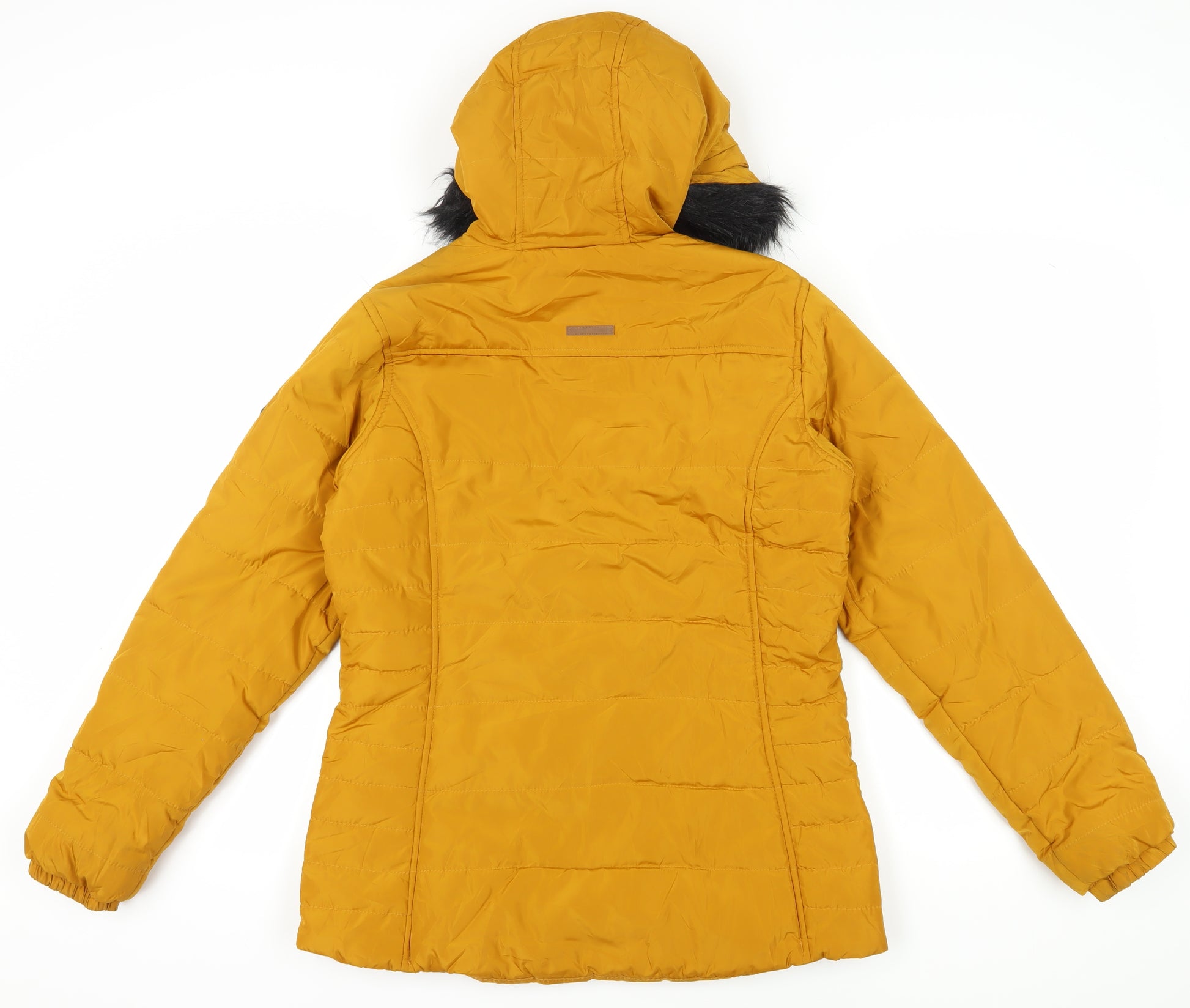 Enhance your wardrobe with this vibrant yellow Regatta puffer jacket, an ideal choice for women seeking warmth and style during the chillier months. Designed for the great outdoors, this jacket seamlessly combines fashion with function. It boasts a regular fit, making it both comfortable and versatile for various body shapes. The jacket's outer shell, made of durable polyester and acrylic, ensures resilience against the elements, while the polyester lining and insulation provide optimal warmth. This mid-length jacket features a protective hood with a chic fur trim, perfect for keeping you cosy. Its functional zip closure and zipped pockets add to the practicality, offering secure storage for your essentials. With long sleeves and no distinct pattern, this jacket maintains a sleek, contemporary look. Designed with a machine-washable fabric, this jacket is easy to care for, making it a practical addition to your daily attire. Although in very good condition, there are lighter marks on the shoulder, adding to its unique character. Priced attractively at £45.00, this jacket is a valuable investment for those who appreciate quality outdoor apparel. Embrace autumn and winter in style with this Regatta jacket, where comfort meets modern design.