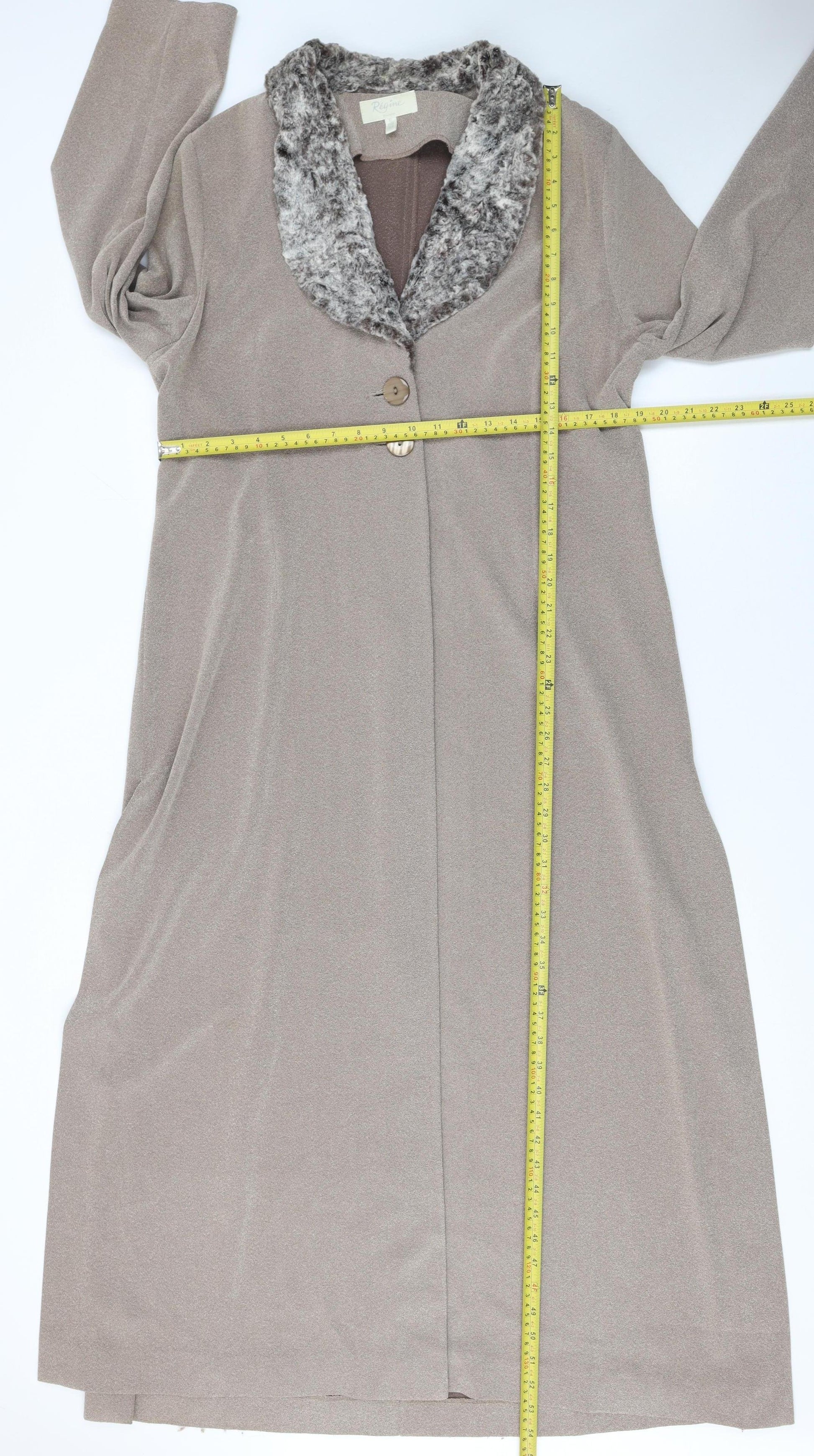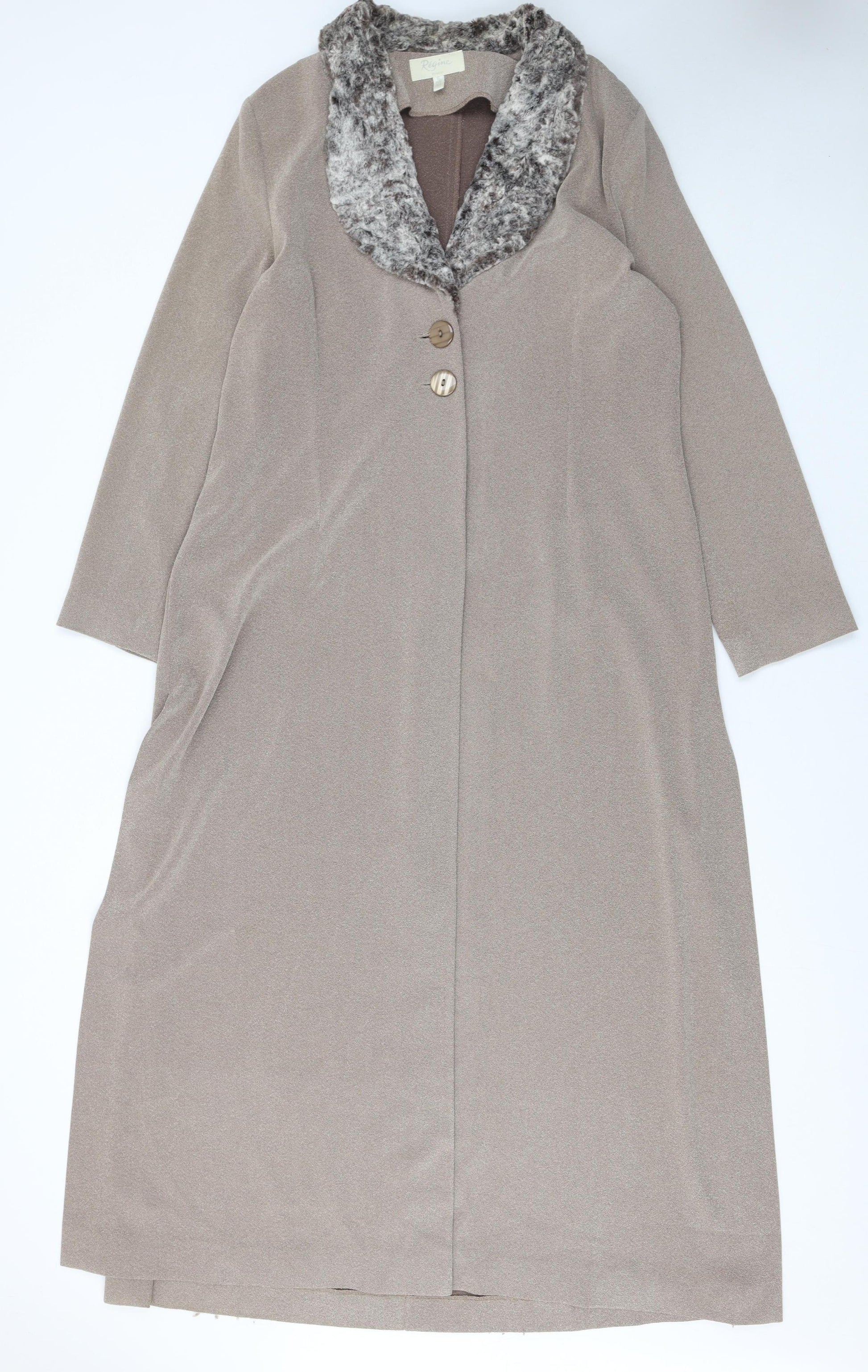 Add a touch of classic elegance to your wardrobe with this beautiful Régine Dublin women’s long coat in a timeless beige tone. Crafted from soft 100% polyester twill fabric, this overcoat features a luxurious faux fur collar that adds both warmth and style. The coat’s structured silhouette and longline design create a sophisticated and flattering fit suitable for both casual and formal occasions. The double-button front closure and simple seam detailing maintain a sleek look, while the subtle texture of the outer material feels smooth and refined. Perfect for autumn and winter months, this coat provides a comfortable layer without unnecessary bulk. The long sleeves and full inner lining offer added cosiness, while the collared neckline lends a touch of vintage sophistication. Pair it effortlessly with dresses or trousers for an elegant day-to-night transition. This piece embodies understated confidence with its neutral beige colour and classic design, ensuring versatility in every outfit. In excellent pre-owned condition, showing minimal signs of gentle wear, this Régine Dublin coat remains an elegant addition to any wardrobe looking for timeless quality and refined appeal.