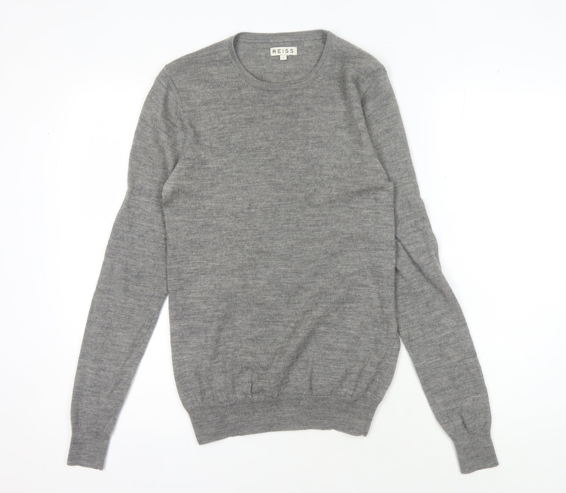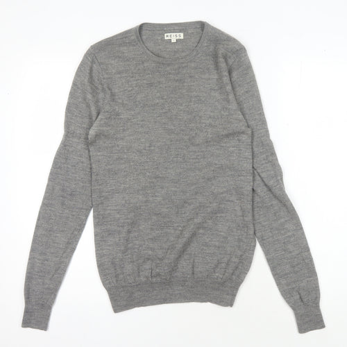 This Reiss grey pullover jumper is a timeless addition to any man's wardrobe. Crafted from luxurious 100% wool, it offers warmth and comfort while maintaining a sleek, sophisticated appearance. The grey colour tone makes it versatile, easily paired with both casual and refined outfits. Featuring a classic crew neck, this jumper is perfect for everyday wear, providing both style and comfort for all seasons. Its regular fit and long sleeves make it an ideal choice for layering on cooler days. The delicate knit fabric enhances its texture, ensuring a soft touch against the skin. Easy to care for, this jumper requires hand washing to maintain its excellent condition. Elevate your casual wardrobe with this elegant and functional piece from Reiss, perfect for various occasions, from a casual day out to a smart-casual office setting.