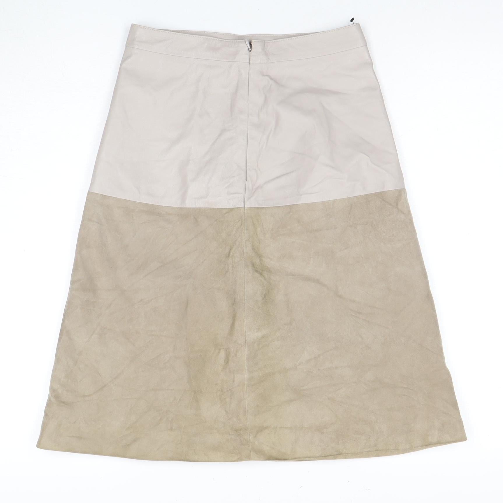 Upgrade your wardrobe with this elegant Reiss Women's A-Line Midi Skirt, crafted from luxurious suede and leather in a sophisticated beige hue. Designed to flatter, the skirt features a zip closure and is perfect for a chic, understated look. While there is slight discolouration visible, this is a quality piece that adds a touch of timeless elegance to any outfit. Ideal for both formal and casual occasions, pair it with a crisp blouse or a cozy knit sweater. A must-have staple for the fashion-conscious woman this season.