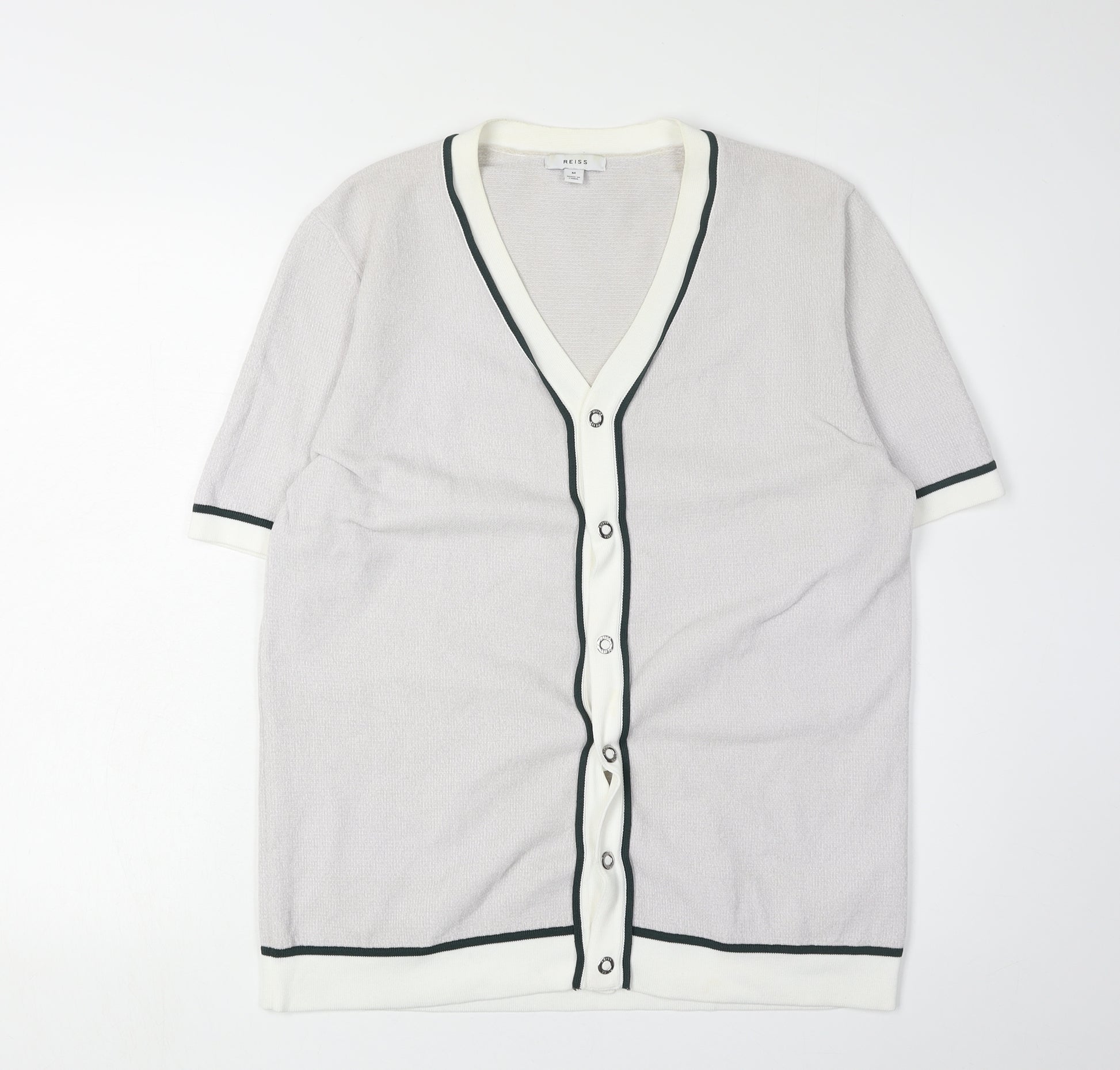 Embrace effortless style with this elegant grey cardigan designed by Reiss. Perfectly crafted for women in a flattering medium size, this lightweight V-neck cardigan adds sophistication to any casual outfit. Made from high-quality polyester, it ensures comfort while maintaining a fashionable edge. The button accents and contemporary knit design make it an ideal choice for spring and summer ensembles. Whether you're heading for a day out or a relaxed evening gathering, this cardigan will seamlessly blend with your wardrobe collection. Pair it with your favourite jeans or a chic skirt to create a versatile look that exudes charm and grace. Its short sleeves provide comfort and ease, making it appropriate for all your daytime activities. With its sophisticated yet simple design, this cardigan adapts effortlessly to any casual occasion, embodying a timeless elegance that will remain a wardrobe staple for years to come. Experience the Reiss quality and style in this beautiful piece that combines practical wearability with refined taste.