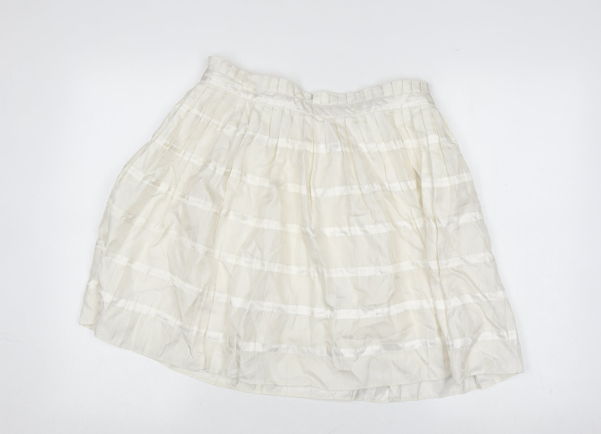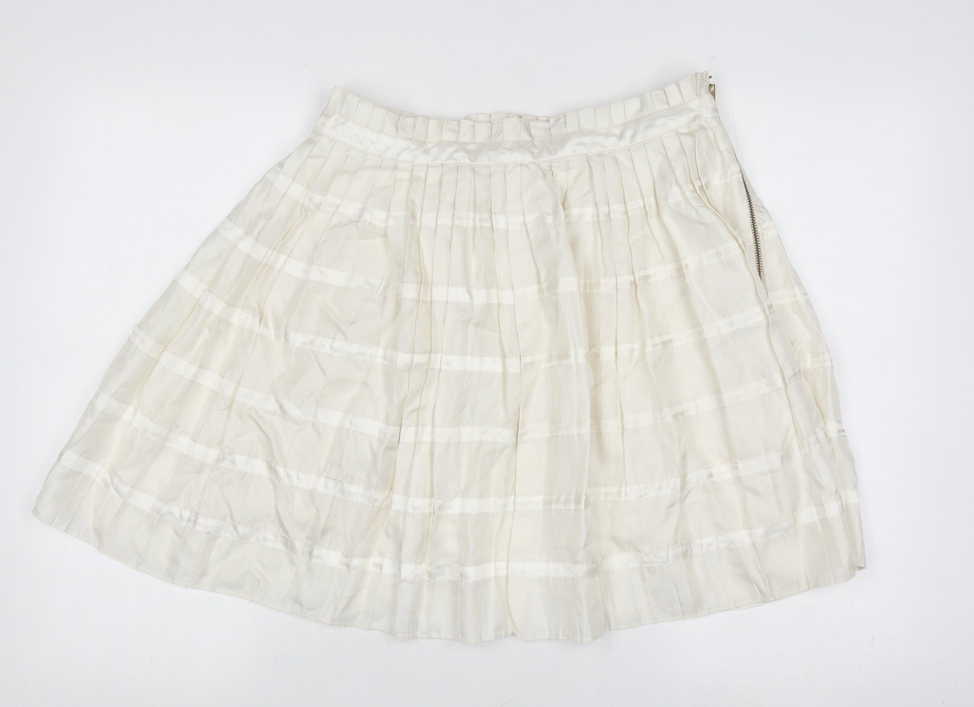 Elevate your wardrobe with this elegant ivory pleated skirt from Reiss. Crafted from luxurious 100% silk, this knee-length skirt is designed for women who appreciate timeless style. Perfect for casual or dressier occasions, it features a comfortable mid-rise waist and a convenient zip closure. The skirt's classic pleated style adds a touch of sophistication, while its light ivory hue ensures versatility in pairing with various tops and accessories. Ideal for spring and summer wear, this skirt is lined to enhance its structure and provide additional comfort. Although gently worn, it remains in excellent condition with no visible flaws, making it a worthwhile addition to any fashion-forward collection. The skirt's simple, no-pattern design makes it a chic choice suited to a wide range of personal styles and themes. Whether you're heading to a casual brunch or a day at the office, this Reiss skirt is sure to impress. Invest in a piece of quality fashion that combines both contemporary flair and timeless elegance.