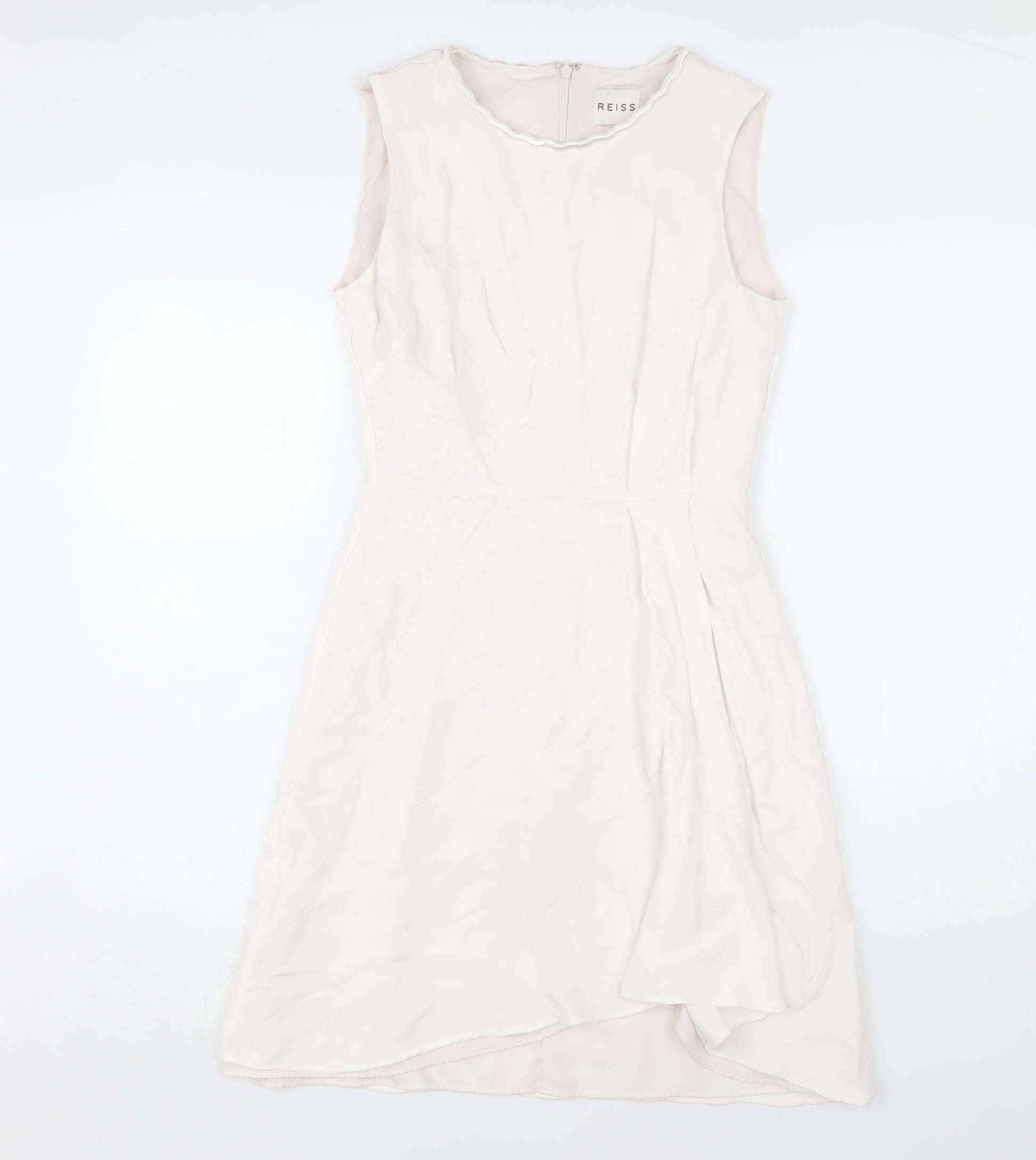 Step out in style with this elegant Reiss dress designed for the modern woman. In a sophisticated ivory colour, this piece exudes class and offers a refined aesthetic suitable for various occasions. Crafted from 100% viscose, the dress promises a soft touch and a lightweight drape, making it both comfortable and stylish. The dress is sleeveless, allowing for easy layering with your favourite jackets or cardigans. The simple round neckline adds a touch of femininity while the subtle zip closure at the back ensures a perfect fit. Ideal for those who appreciate understated charm, this dress can seamlessly transition from day to evening wear. Keep it clean with the dry-clean-only care instructions to maintain its pristine condition. Whether you're heading to a business meeting or a casual outing, this Reiss dress makes an excellent choice for effortless elegance.