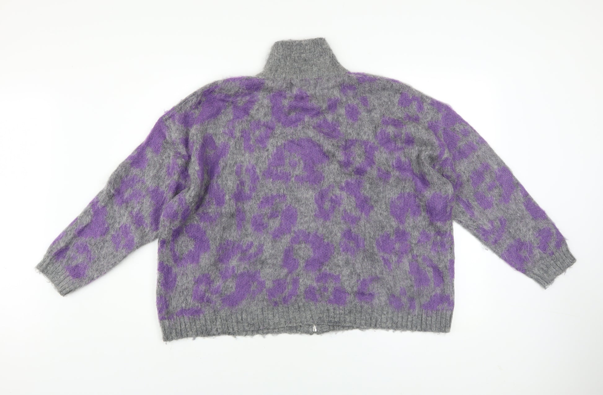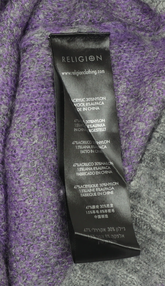 Discover laidback luxury with this Religion women’s grey leopard knit bomber jacket in size 10. Crafted from a soft blend of acrylic, nylon, wool, and alpaca, it offers both warmth and breathability, ideal for chilly autumn or winter days. The full zip feature with distinctive O-ring puller adds a stylish and practical touch, while the relaxed fit ensures comfort without sacrificing shape. Its animal-print design in striking purple tones against a soft grey backdrop brings an effortless statement look to everyday outfits. Whether layered over a tee for casual wear or paired with smart separates for a trend-forward ensemble, this piece encapsulates Religion’s modern London aesthetic. Its short length and knitted fabric construction make it ideal for both indoor layering and outdoor casual styling. In excellent pre-loved condition, this jacket shows minimal signs of wear and retains its snug texture and bold print. The combination of cosy materials like wool and alpaca adds a touch of premium softness to the feel, while the ribbed cuffs and hem provide a comfortable fit. Perfect for fashion-conscious individuals who appreciate standout design with lasting wearability, this Religion bomber jacket serves as a wardrobe staple with personality. Combine it with jeans, boots, or tailored trousers for a versatile street-style look that transitions between day and night with ease. A must-have for those who love expressive, high-quality knitwear with an urban edge.