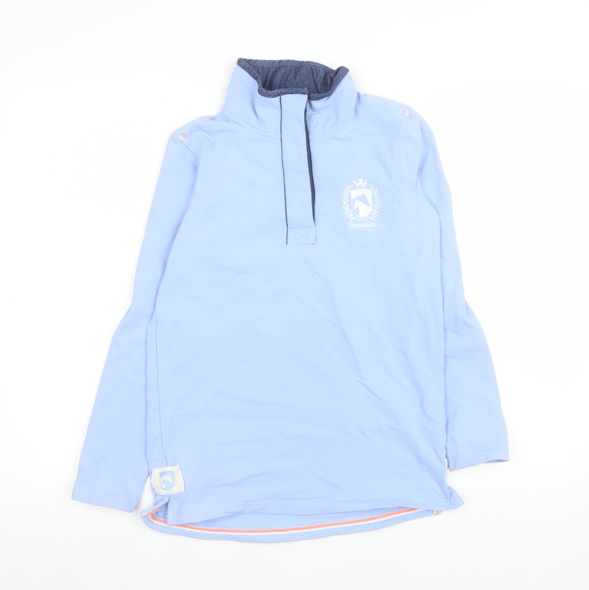 This lovely Requisite women's polo top in a cheerful powder blue shade offers a classic yet practical style that’s ideal for everyday casual wear or equestrian activities. Crafted from a soft cotton and elastane blend, this long-sleeve top provides both comfort and flexibility, making it perfect for layering or wearing alone on cooler spring and autumn days. The fabric has a smooth, breathable jersey feel with just enough stretch for ease of movement. Featuring a high stand collar with a dark contrast lining and a half-zip front closure, it adds both function and style to your wardrobe. The front is subtly adorned with the Requisite logo, giving it a sporty, polished look. The durable cotton-rich material ensures easy care and long-lasting wear, while the regular fit sits comfortably against the body without restricting movement. Designed with attention to detail, it’s ideal for casual outings, riding sessions, or relaxed weekend wear. Condition is excellent, showing minimal signs of previous use with no visible imperfections. Machine washable for added convenience, this piece combines comfort, quality, and timeless simplicity — a versatile addition to any wardrobe looking for understated sporty charm. Whether for an active lifestyle or a laid-back look, this Requisite blue polo top is a go-to item for effortless style and comfort.